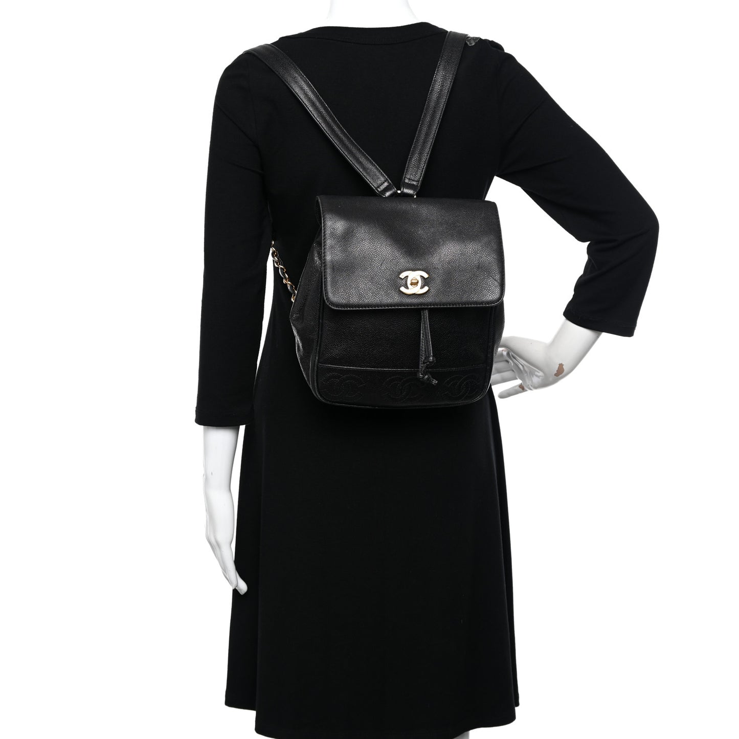 This is an authentic CHANEL Caviar CC Backpack in Black. This stylish backpack is crafted of luxurious caviar leather in black. The bag features leather shoulder straps with a gold classic Chanel CC turn lock. This flap opens to a black partitioned fabric interior with zipper pockets.Follow this item for alerts. Chanel is a registered trademark of Chanel. FASHIONPHILE is not affiliated with Chanel.