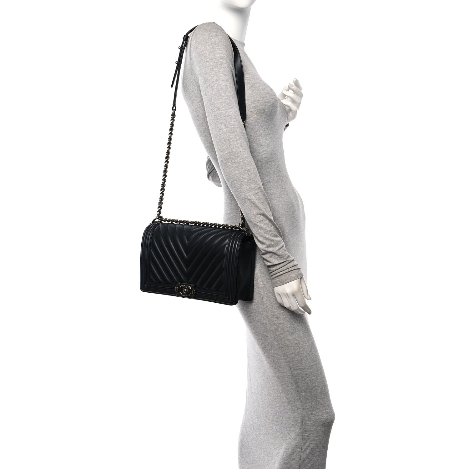This is an authentic CHANEL Calfskin Chevron Quilted New Medium Boy Flap in Black. This chic shoulder bag is crafted of chevron quilted calfskin leather framed by linear quilting in black. The bag features a dark silver chain link shoulder strap with a leather shoulder pad, and a matching boy CC push lock on the crossover flap. This opens to a black fabric interior with zipper and patch pockets.Follow this item for alerts. Chanel is a registered trademark of Chanel. FASHIONPHILE is not affiliated with Chanel.
