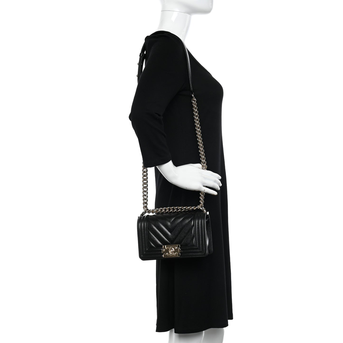 This is an authentic CHANEL Caviar Chevron Quilted Small Boy Flap in Black. This chic shoulder bag is crafted of finely grained black caviar calfskin leather. The shoulder bag features an polished gold chain link shoulder strap with a leather shoulder pad, and a chevron quilted flap with a linear quilted border and a Chanel CC boy push lock. The flap opens to a matching black fabric interior with a pocket.Follow this item for alerts. Chanel is a registered trademark of Chanel. FASHIONPHILE is not affiliated with Chanel.