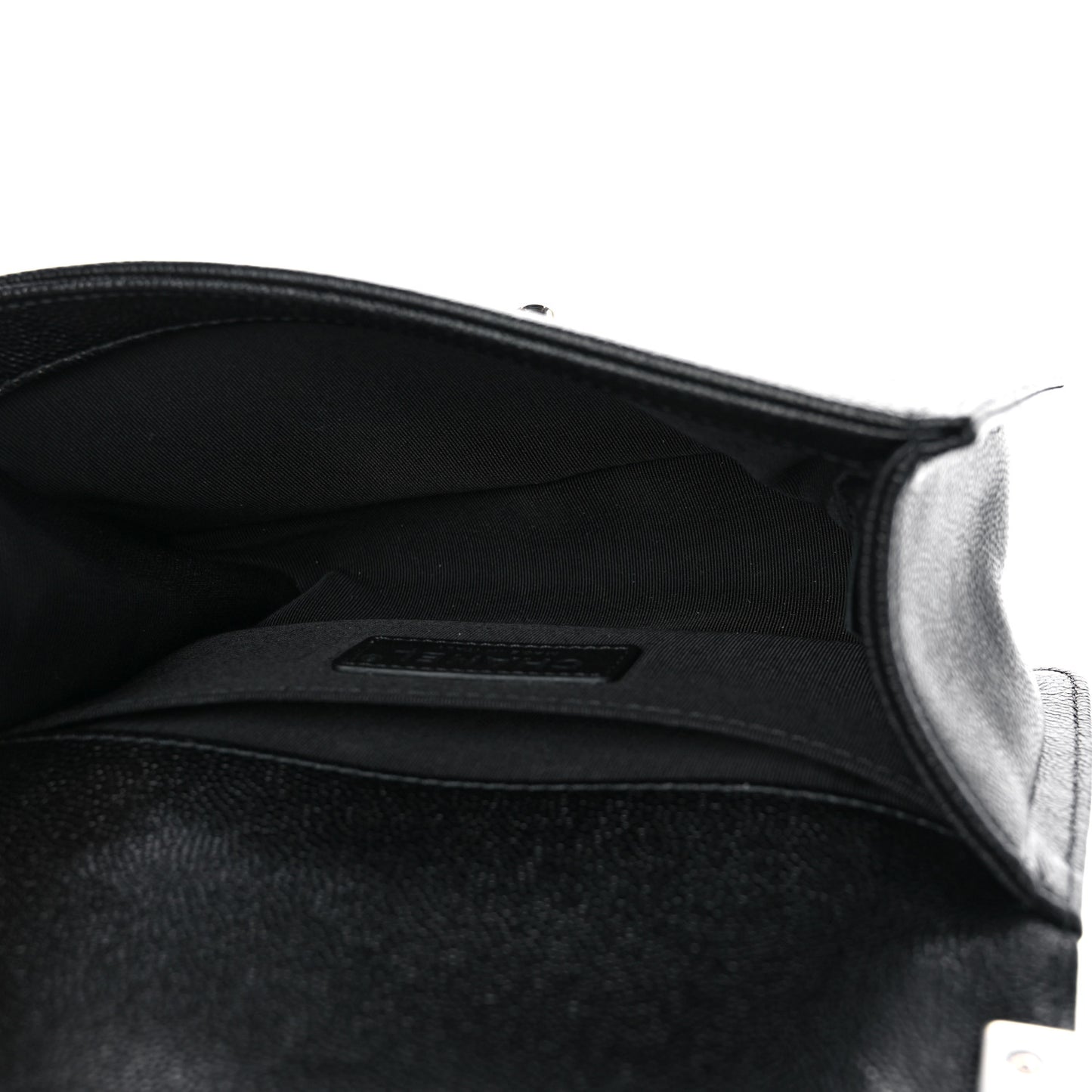 This is an authentic CHANEL Caviar Chevron Quilted Small Boy Flap in Black. This chic shoulder bag is crafted of finely grained caviar calfskin leather in black. The shoulder bag featuresa polished silver chain link shoulder strap with a leather shoulder pad, and a chevron quilted flap with a linear quilted border and a polished silver CC push lock. The flap opens to a matching fabric interior with a patch pocket.