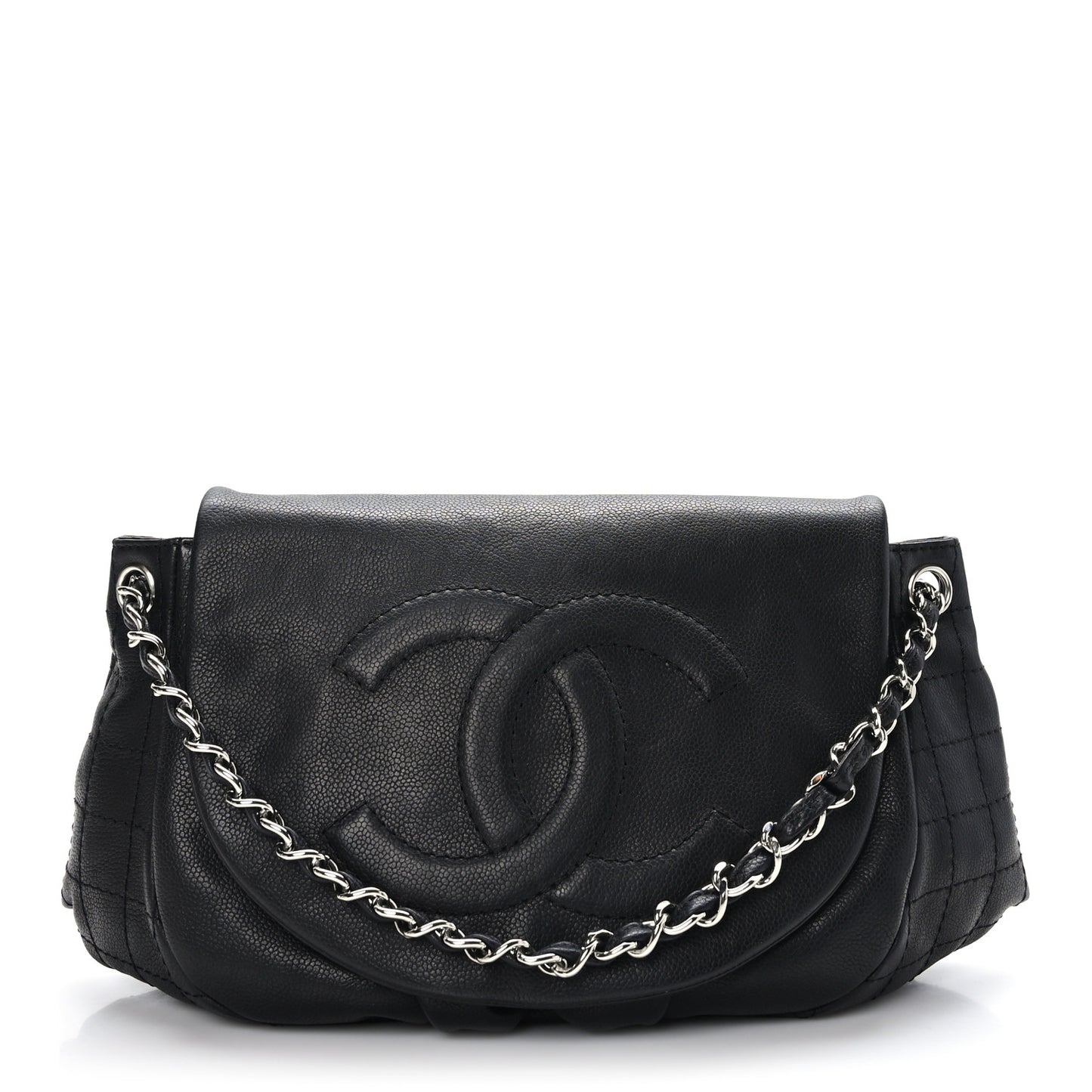 This is an authentic CHANEL Caviar Half Moon Large Flap in Black. This stunning shoulder bag is beautifully crafted of luxurious caviar leather in black. The handbag features a polished silver chain link leather threaded shoulder strap and a facing flap with a quilted stitched Chanel CC logo. The flap opens to a black leather interior with zipper and patch pockets.Follow this item for alerts. Chanel is a registered trademark of Chanel. FASHIONPHILE is not affiliated with Chanel.