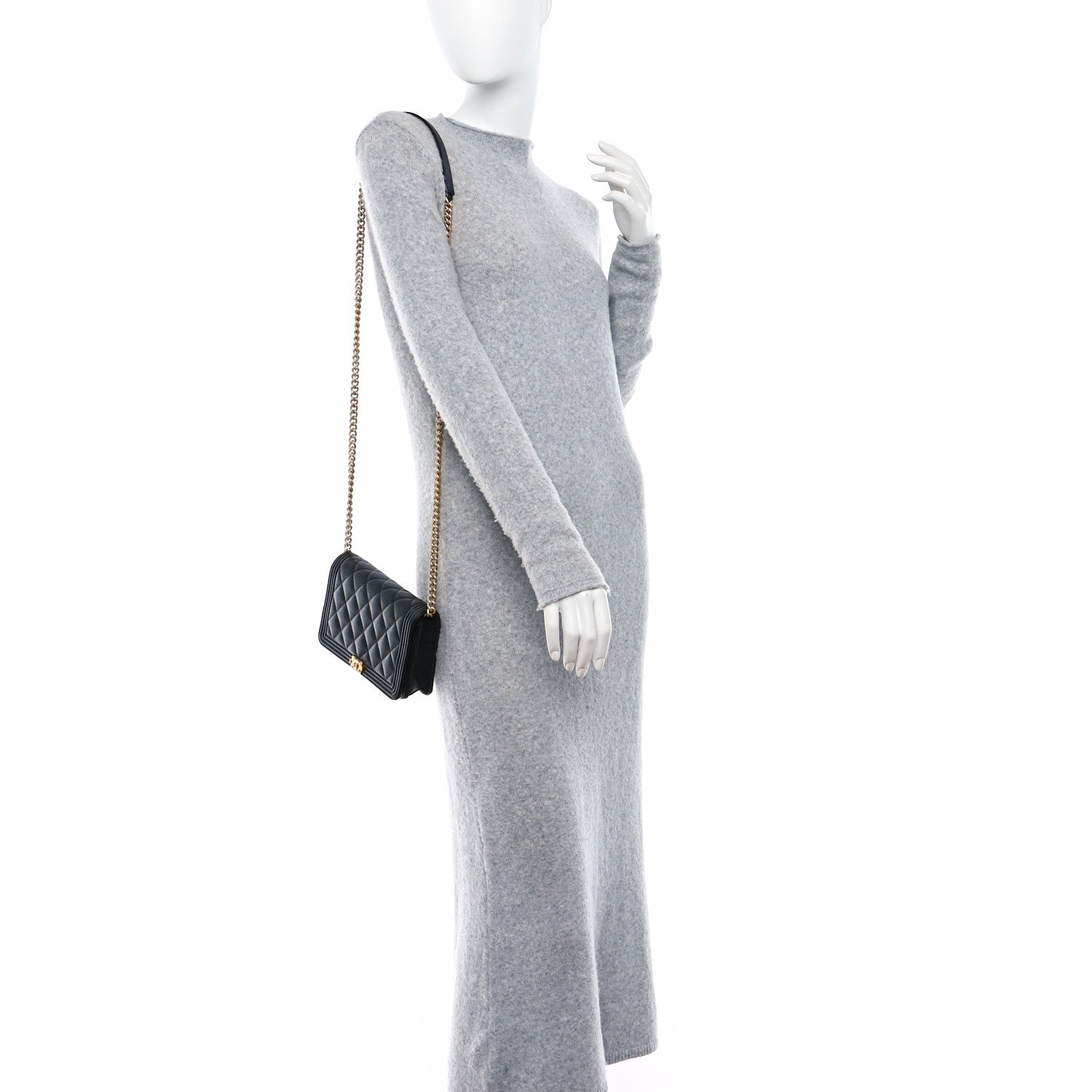 This is an authentic CHANEL Caviar Quilted Boy Wallet On Chain WOC in Black. This stunning wallet is crafted of luxurious diamond quilted caviar leather in black with peripheral linear quilting. The bag features an aged gold chain-link shoulder strap and a faux aged gold Chanel Boy CC press lock. The facing flap opens to a compact interior of black leather and fabric with card slots, a patch pocket, and a zipper compartment.Follow this item for alerts. Chanel is a registered trademark of Chanel. FASHIONPHILE is not affiliated with Chanel.