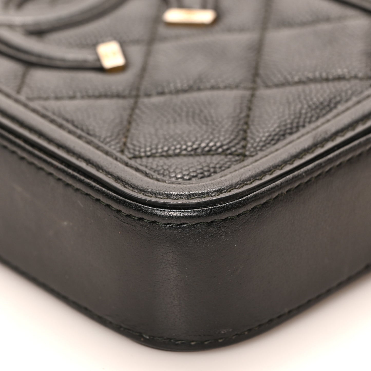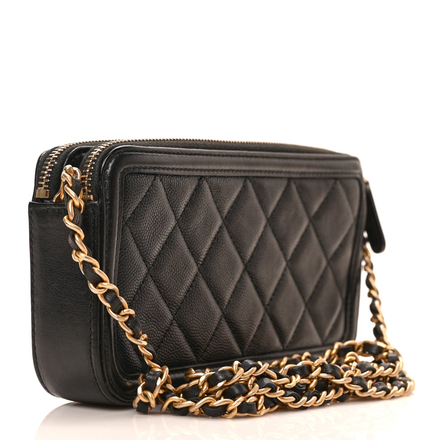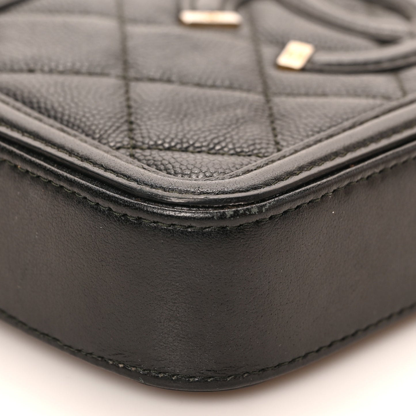 This is an authentic CHANEL Caviar Quilted CC Filigree Clutch With Chain in Black. This stylish shoulder bag is crafted of diamond quilted caviar leather in black with smooth black leather trim. The bag features an optional light gold chain link leather threaded shoulder strap and matching light gold tips on the frontal Chanel CC logo patch. The two top zippers open to a black fabric interior with card slots.Follow this item for alerts. Chanel is a registered trademark of Chanel. FASHIONPHILE is not affiliated with Chanel.