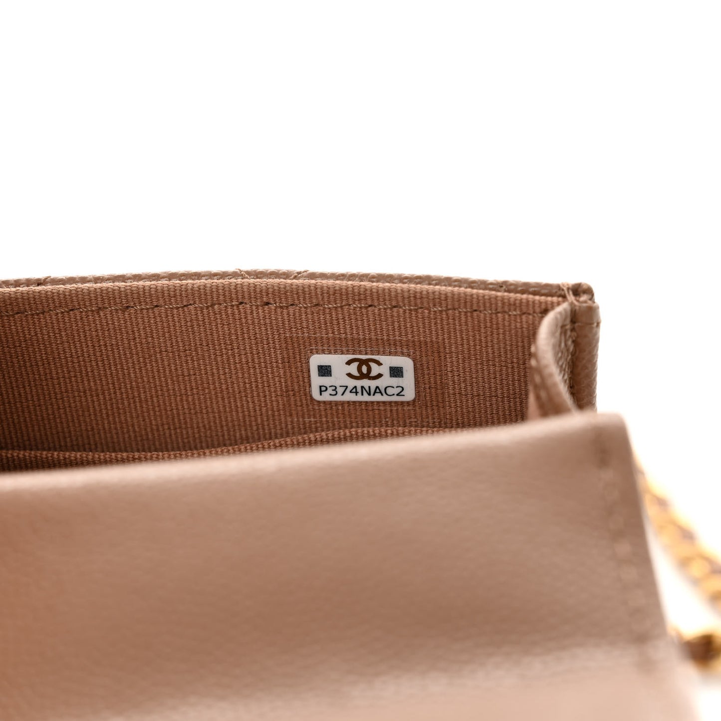 This is an authentic CHANEL Caviar Quilted Coco First Clutch With Chain in Beige. This bag is crafted of diamond quilted caviar leather in dark beige. The bag features a leather-threaded aged gold chain-link shoulder strap and a crossover flap with a matching gold CC logo. The flap opens to a matching fabric interior with pockets.Follow this item for alerts. Chanel is a registered trademark of Chanel. FASHIONPHILE is not affiliated with Chanel.