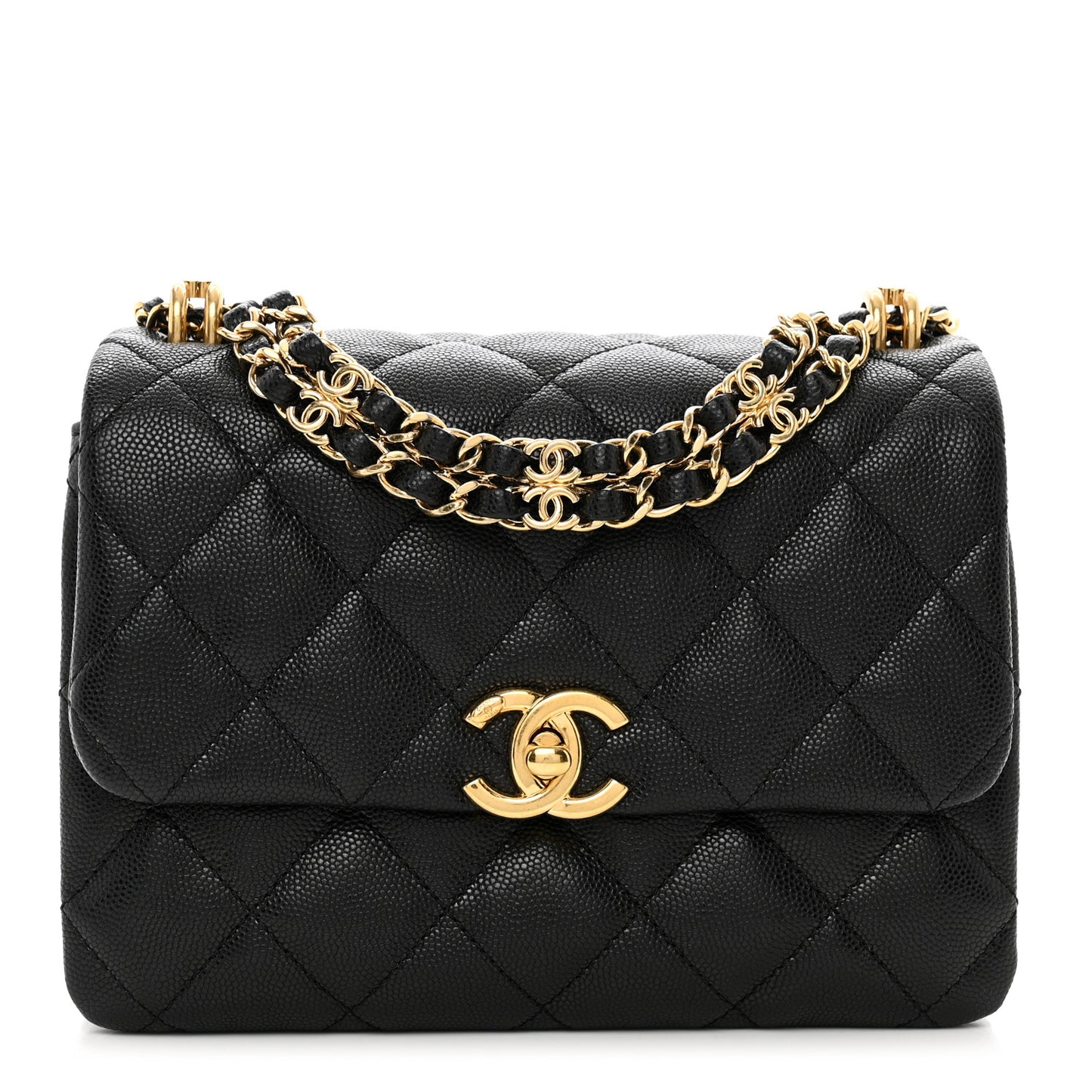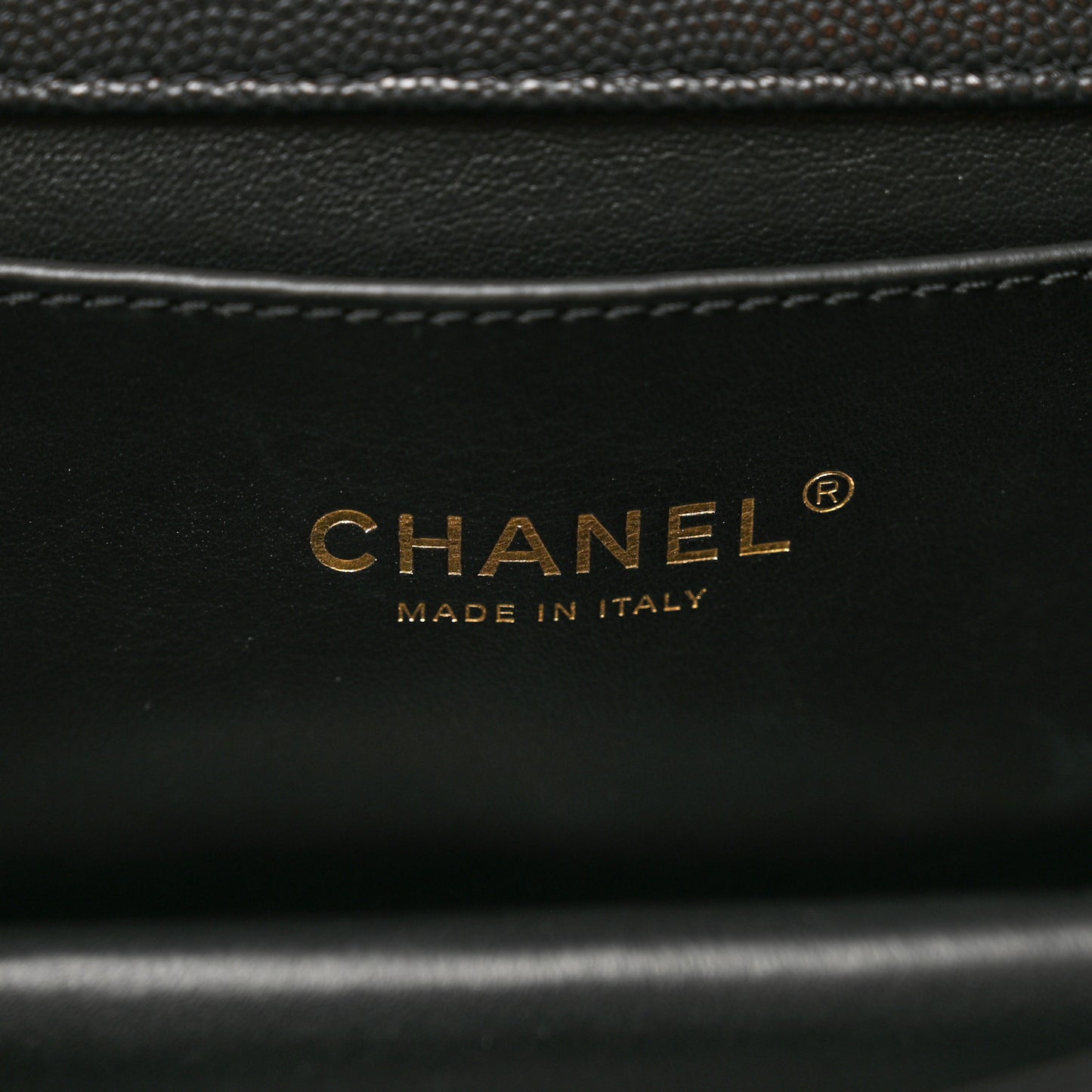 This is an authentic CHANEL Caviar Quilted Coco First Flap in Black. This chic mini crossbody classic is crafted of quilted caviar leather in black. The bag features a gold chain link leather threaded shoulder strap and a gold classic CC turn lock. This opens the flap to a black leather interior.Follow this item for alerts. Chanel is a registered trademark of Chanel. FASHIONPHILE is not affiliated with Chanel.