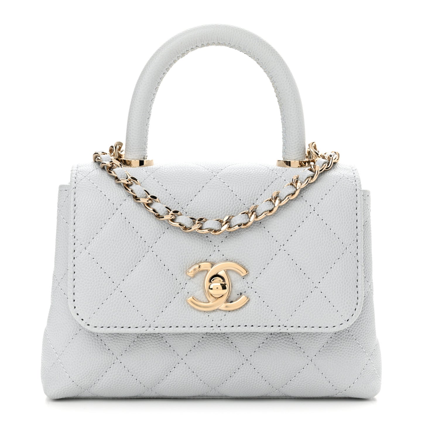 This is an authentic CHANEL Caviar Quilted Coco Handle Clutch With Chain Flap in Light Blue. This stylish and classic tote is crafted of diamond-stitched grained caviar leather in light blue. The shoulder bag features a rolled leather top handle, a leather-threaded gold chain-link shoulder strap, and a gold CC turn-lock closure. The flap opens to a partitioned matching leather interior with a zipper pocket.Follow this item for alerts. Chanel is a registered trademark of Chanel. FASHIONPHILE is not affiliated with Chanel.