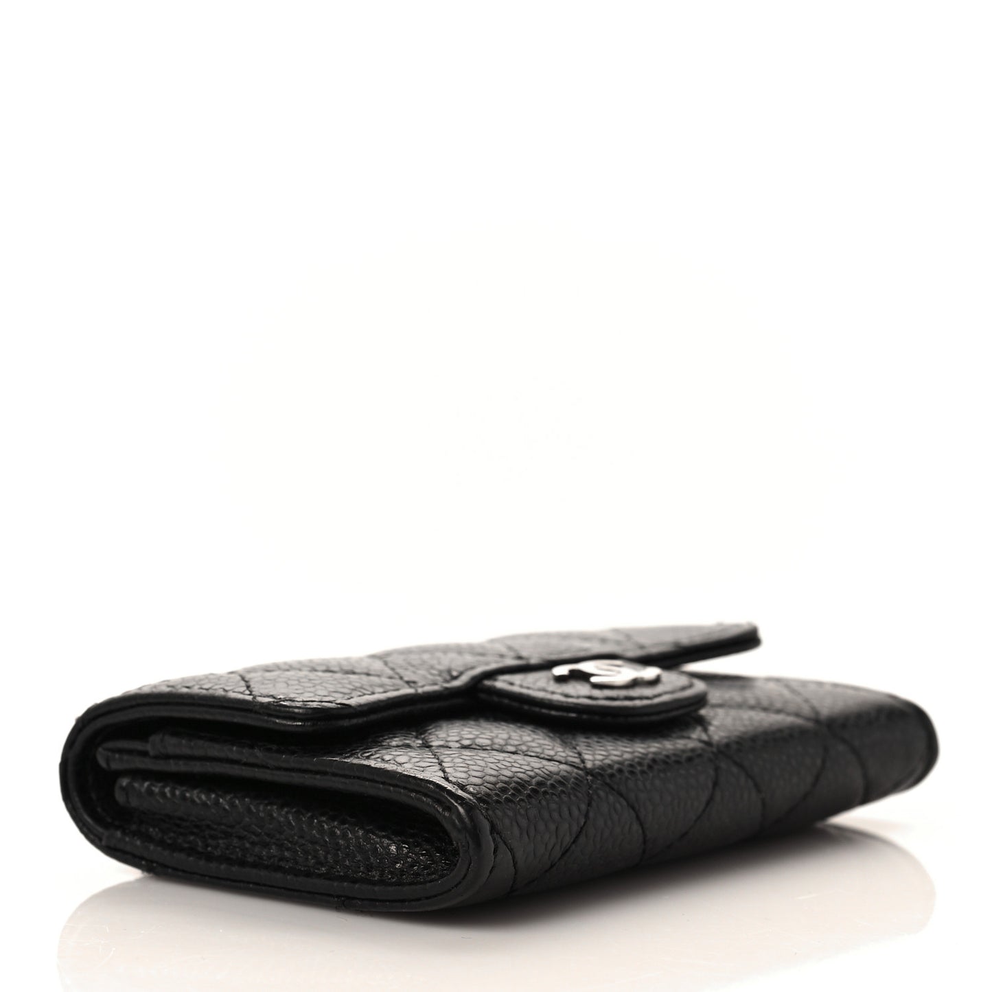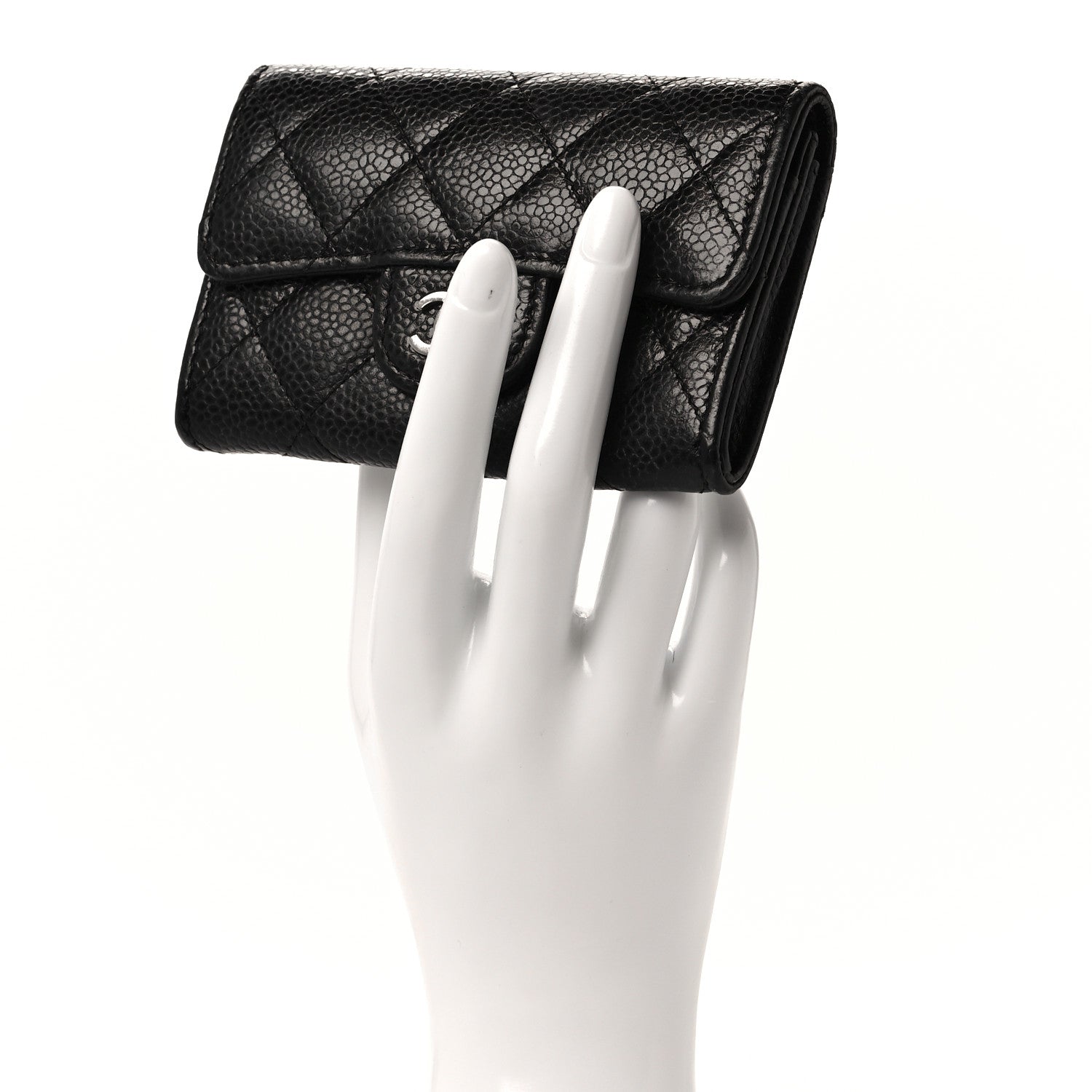 This is an authentic CHANEL Caviar Quilted Flap Card Holder in Black. This luxurious cardholder is crafted of caviar leather in black. It features a polished light silver Chanel CC logo and opens to a burgundy interior.Follow this item for alerts. Chanel is a registered trademark of Chanel. FASHIONPHILE is not affiliated with Chanel.