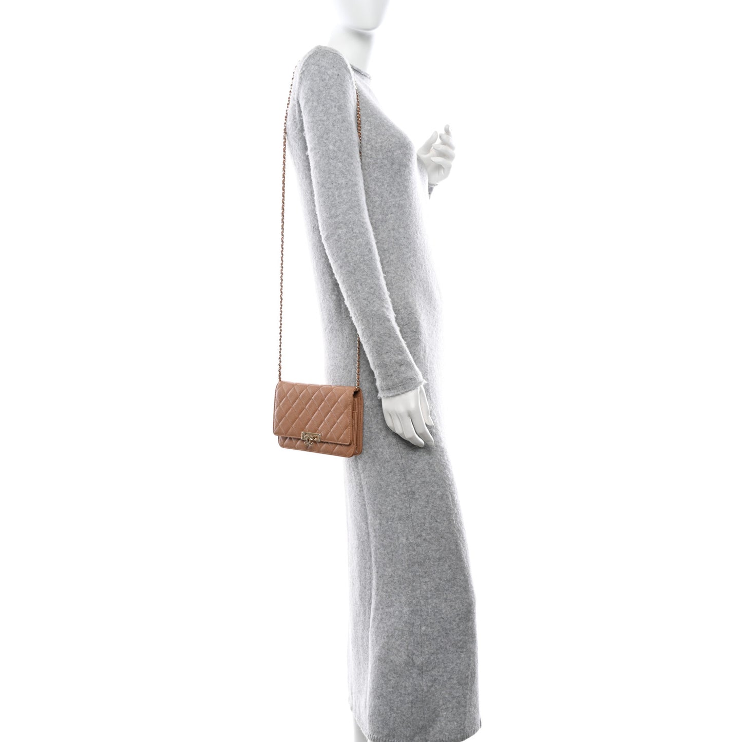 This is an authentic CHANEL Caviar Quilted Golden Class Wallet On Chain WOC in Beige. This lovely and stylish shoulder bag is crafted of diamond quilted caviar calfskin leather in beige. It features a leather threaded polished gold chain shoulder strap and a flap with a gold CC clasp. The flap opens to a matching leather and fabric interior with card slots, a patch pocket, and a zipper compartment.Follow this item for alerts. Chanel is a registered trademark of Chanel. FASHIONPHILE is not affiliated with Chanel.