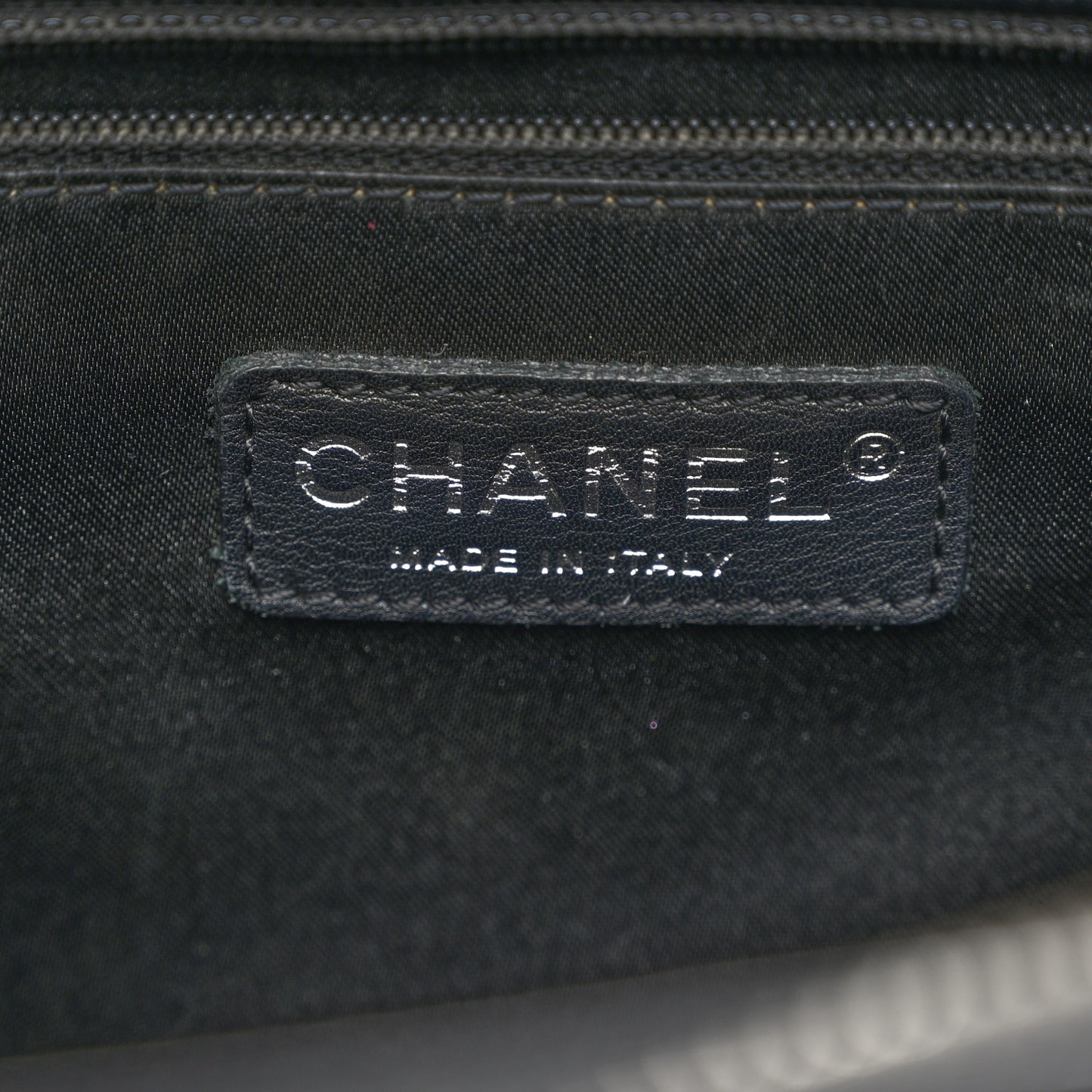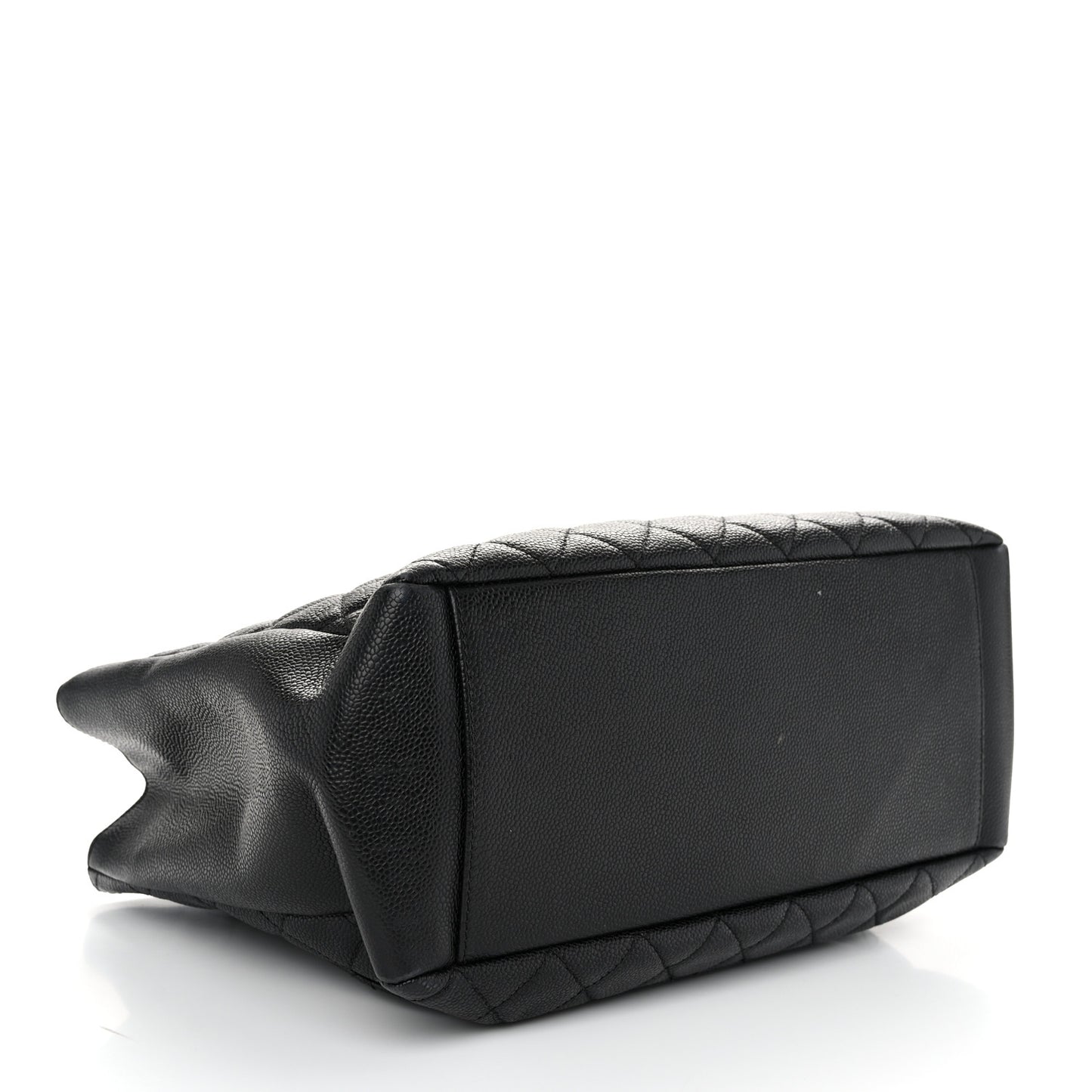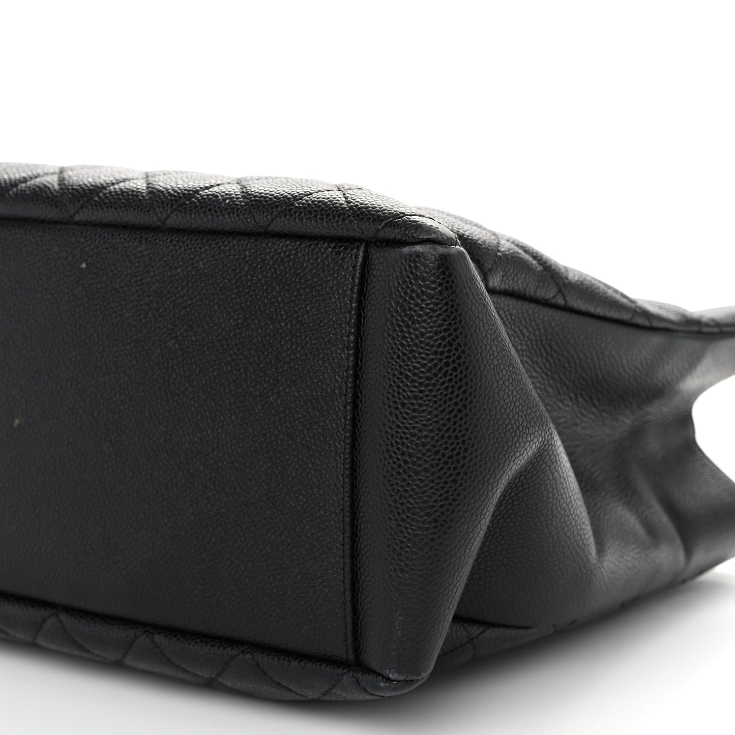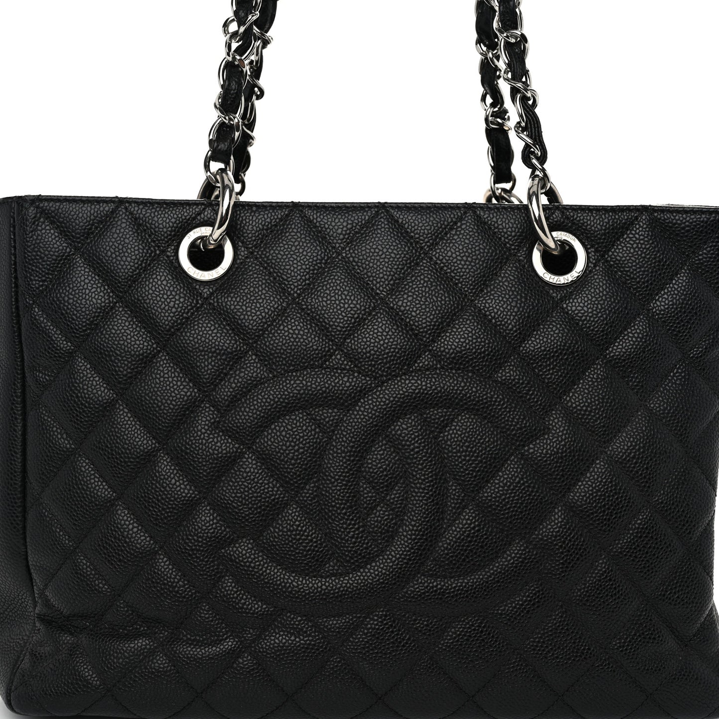 This is an authentic CHANEL Caviar Quilted Grand Shopping Tote GST in Black. This stylish tote is crafted of diamond quilted caviar leather in black. The bag features a rear slip pocket, leather threaded chain straps with leather shoulder pads, and a quilted Chanel CC logo on the front and back. The top is open to a partitioned black fabric interior with zipper and patch pockets.Follow this item for alerts. Chanel is a registered trademark of Chanel. FASHIONPHILE is not affiliated with Chanel.