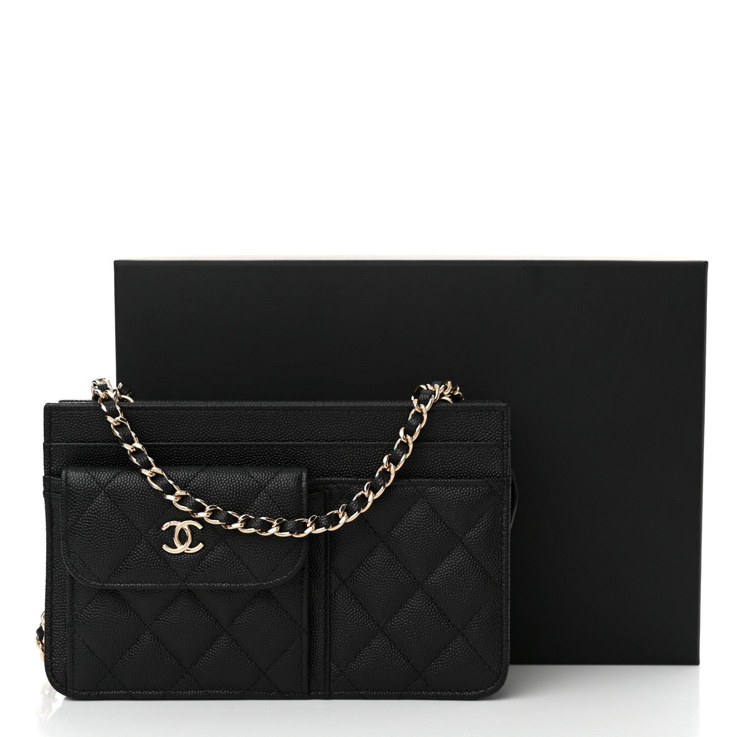This is an authentic CHANEL Caviar Quilted In & Out Chain Wallet in Black. This wallet is crafted of grained calfskin leather in black. The wallet features an exterior pocket with a gold Chanel CC logo and a wrap around zipper that opens to a black fabric interior with two card slot panels divided by a central zipper pocket.Follow this item for alerts. Chanel is a registered trademark of Chanel. FASHIONPHILE is not affiliated with Chanel.