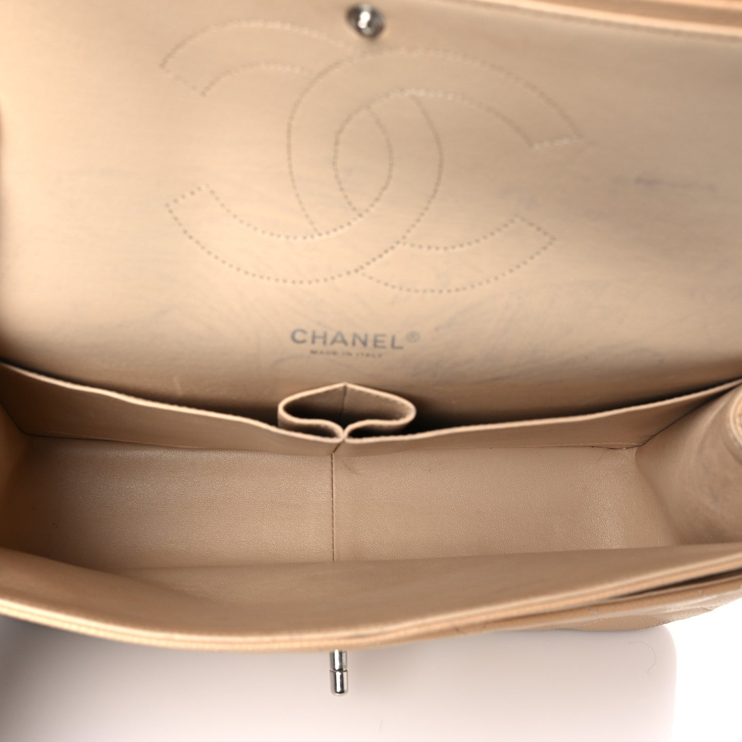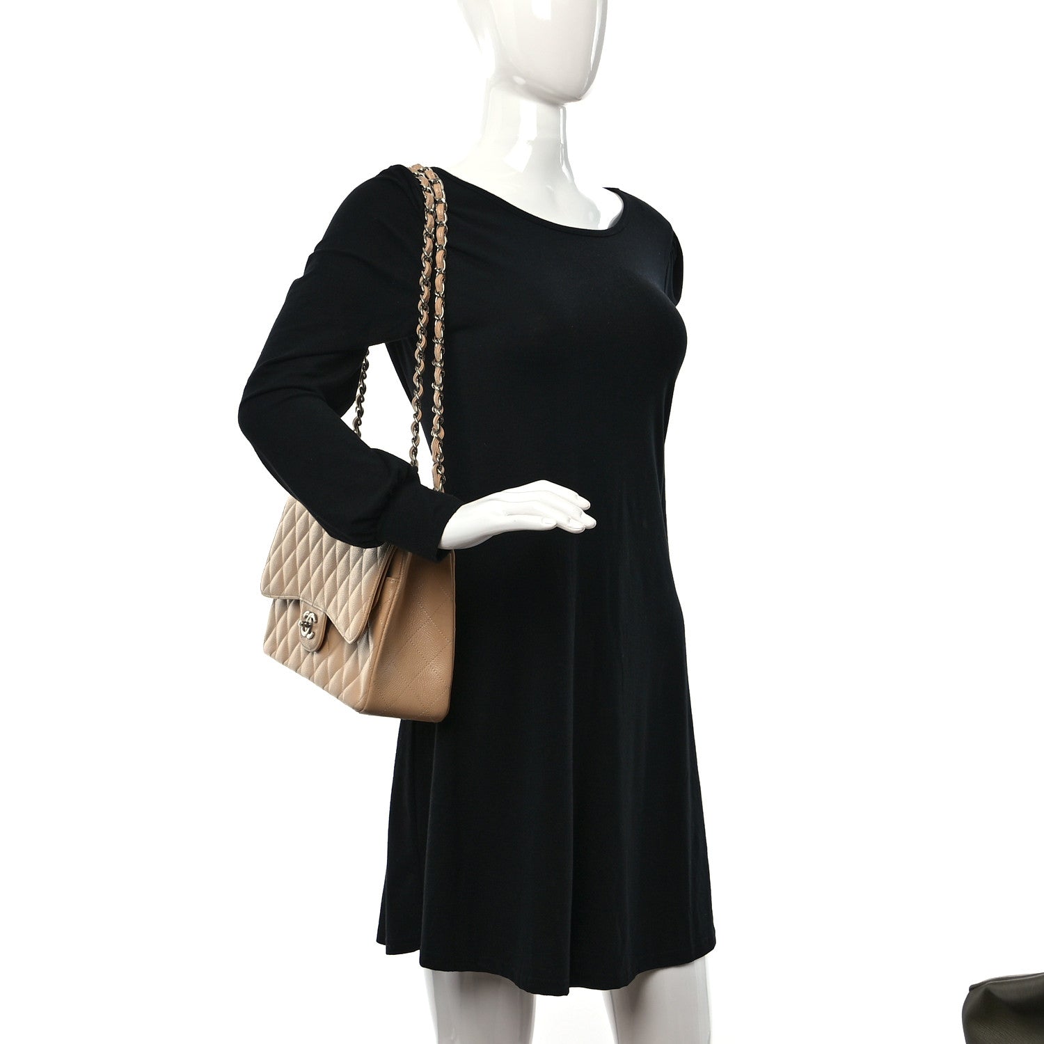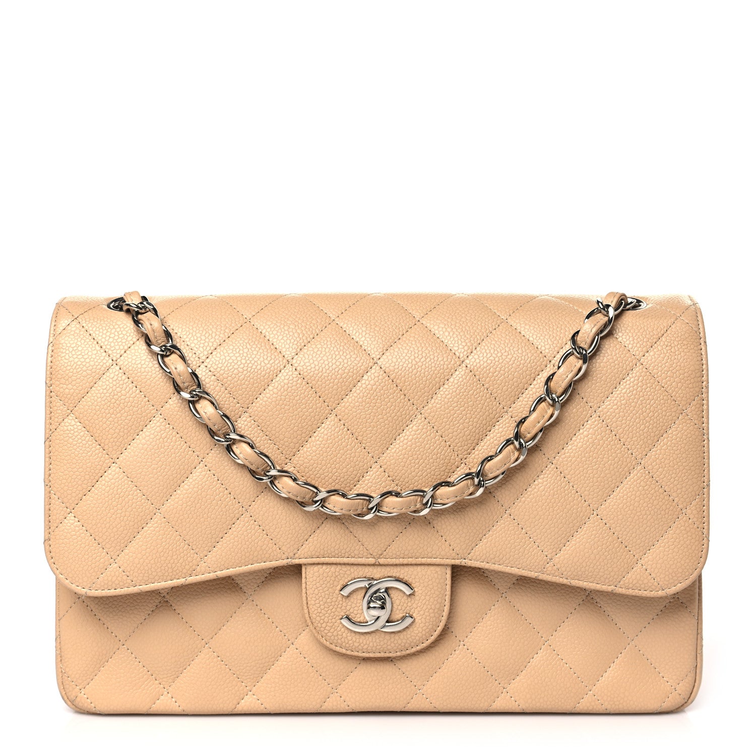This is an authentic CHANEL Caviar Quilted Jumbo Double Flap in Beige Clair. This stylish shoulder bag is crafted of luxurious diamond quilted caviar leather in light beige. This bag features a leather threaded chain link shoulder strap with polished silver hardware. The Chanel CC turn-lock opens to an inner flap and beige leather interior with pockets.Follow this item for alerts. Chanel is a registered trademark of Chanel. FASHIONPHILE is not affiliated with Chanel.