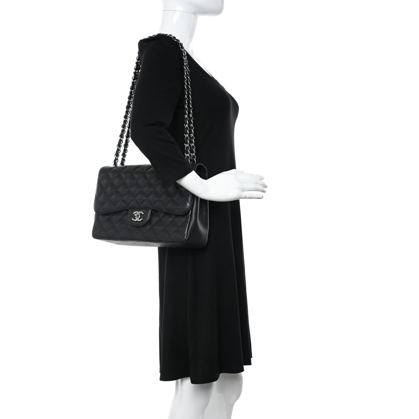 This is an authentic CHANEL Caviar Quilted Jumbo Double Flap in Black. This elegant shoulder bag is crafted of luxurious caviar textured leather in black. The bag features a leather threaded silver chain-link shoulder strap, a rear patch pocket, and a crossover flap with a silver classic CC turn lock. The flap opens to reveal an inner flap and a burgundy leather interior with patch pockets.Follow this item for alerts. Chanel is a registered trademark of Chanel. FASHIONPHILE is not affiliated with Chanel.