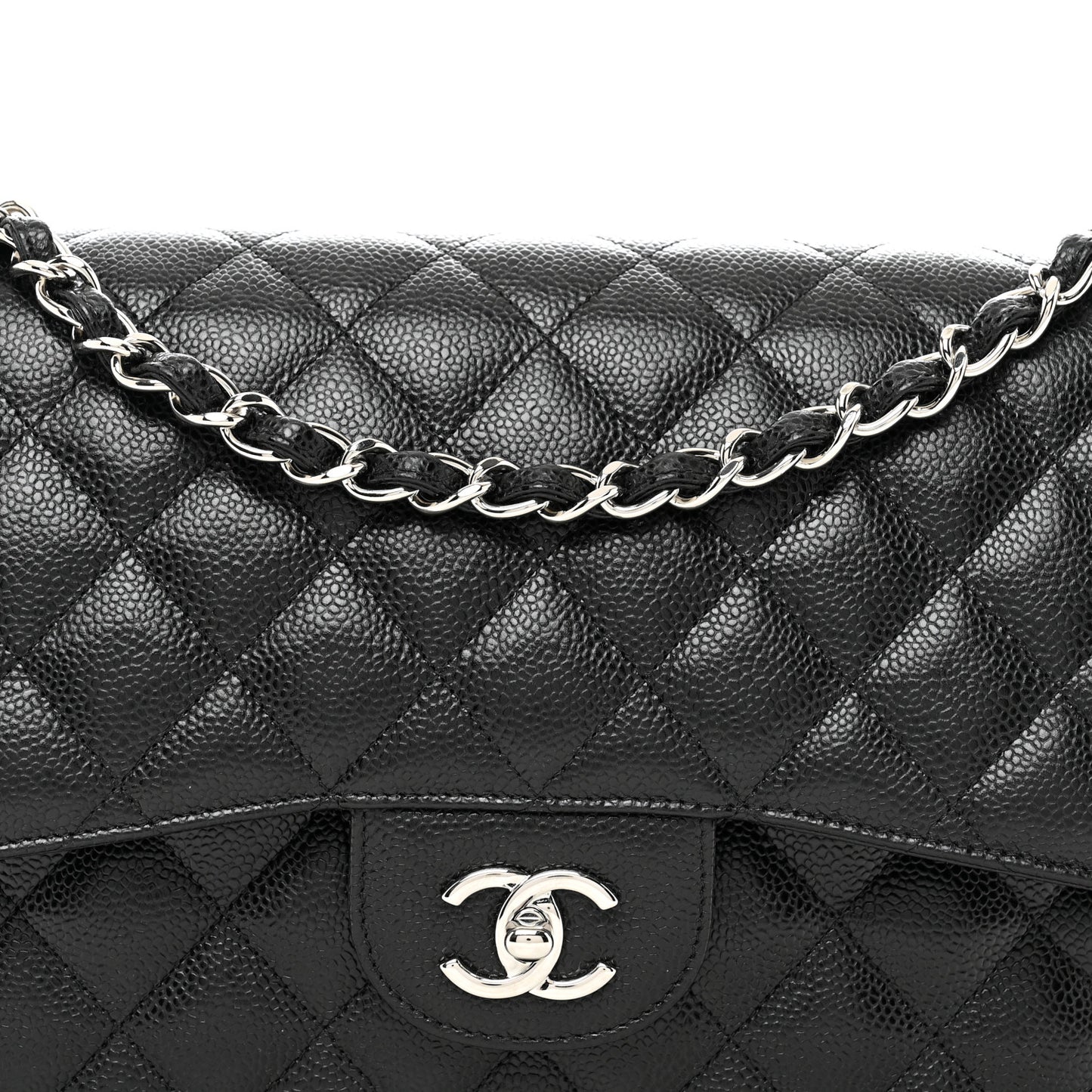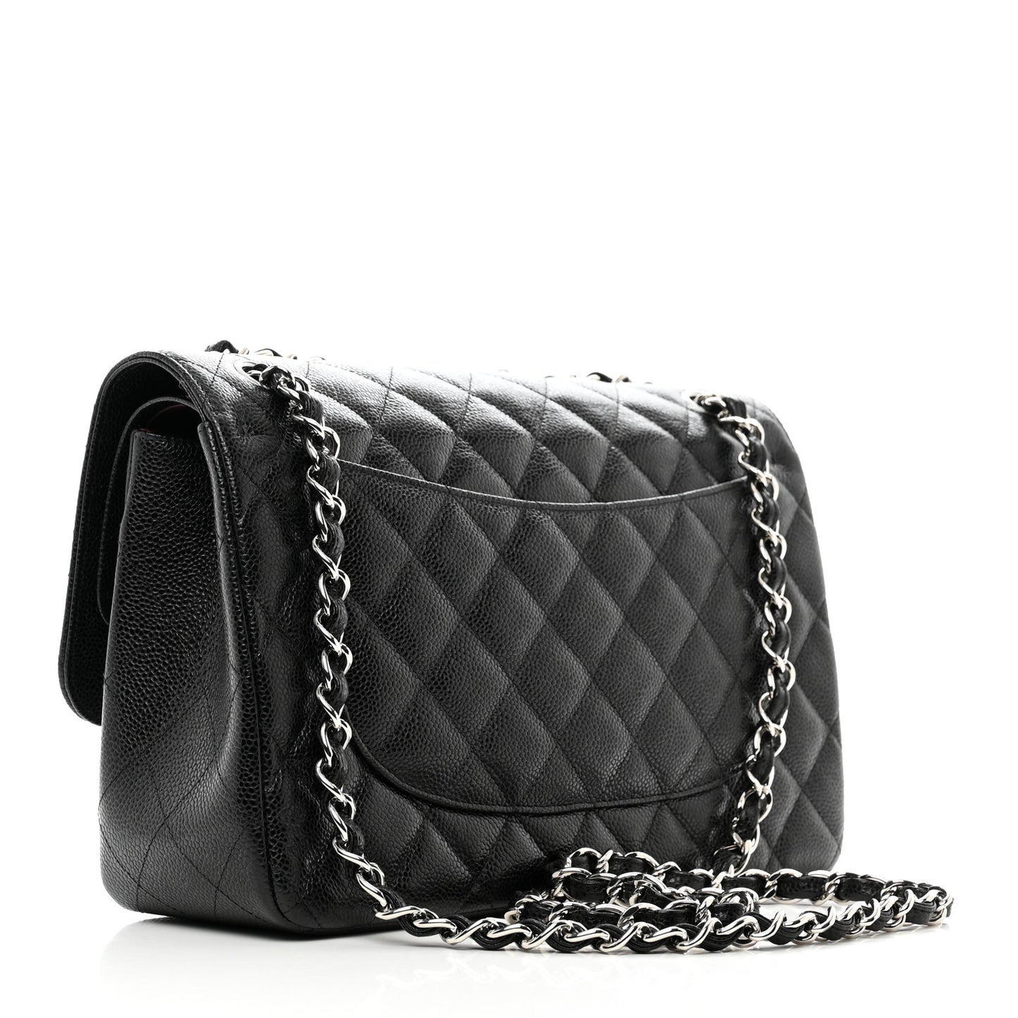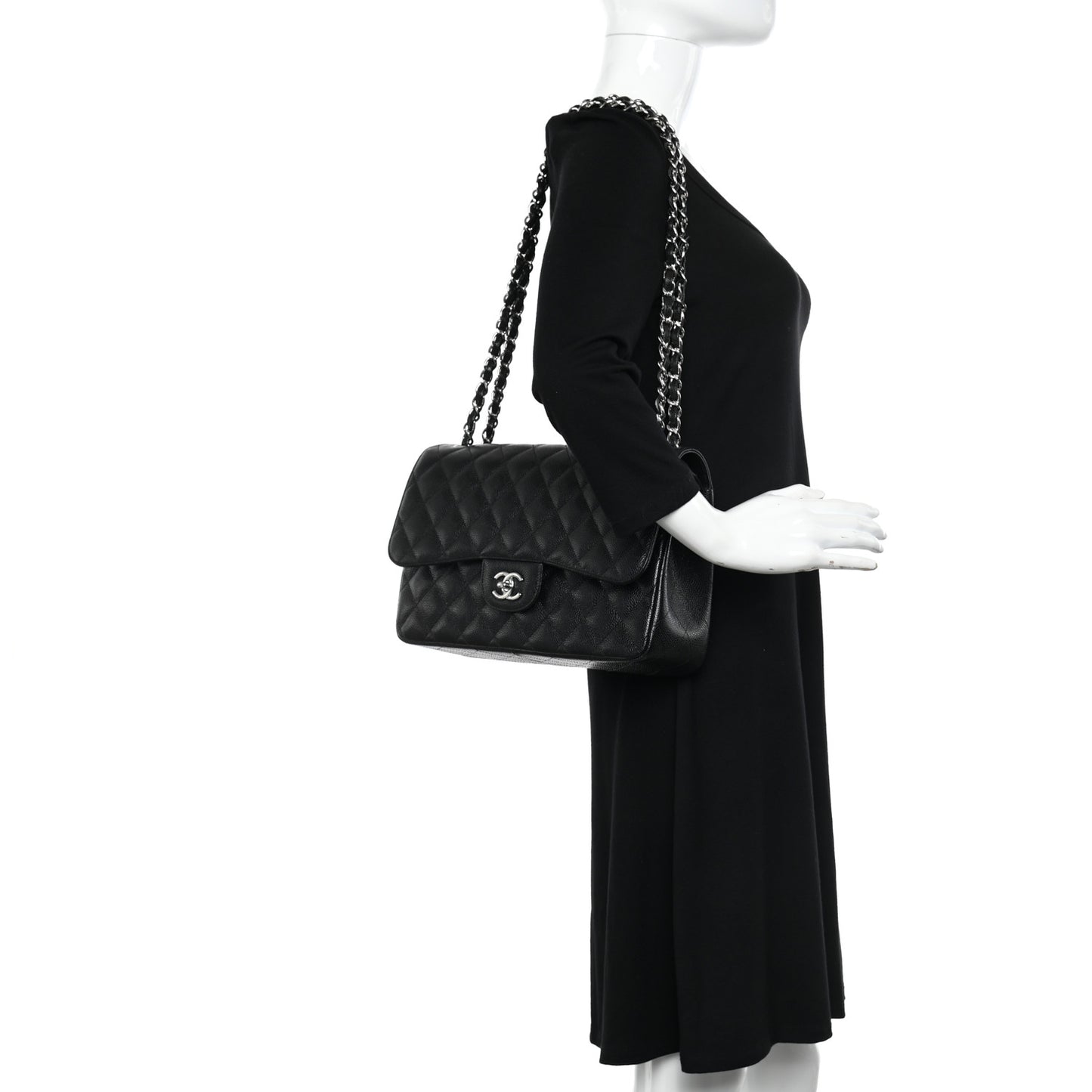 This is an authentic CHANEL Caviar Quilted Jumbo Double Flap in Black. This stylish shoulder bag is crafted of luxurious caviar textured leather. It features leather threaded polished silver chain link shoulder straps, a rear patch pocket, and a front flap with a silver CC turn lock. The flap opens to a Bordeaux leather interior with patch pockets.Follow this item for alerts. Chanel is a registered trademark of Chanel. FASHIONPHILE is not affiliated with Chanel.