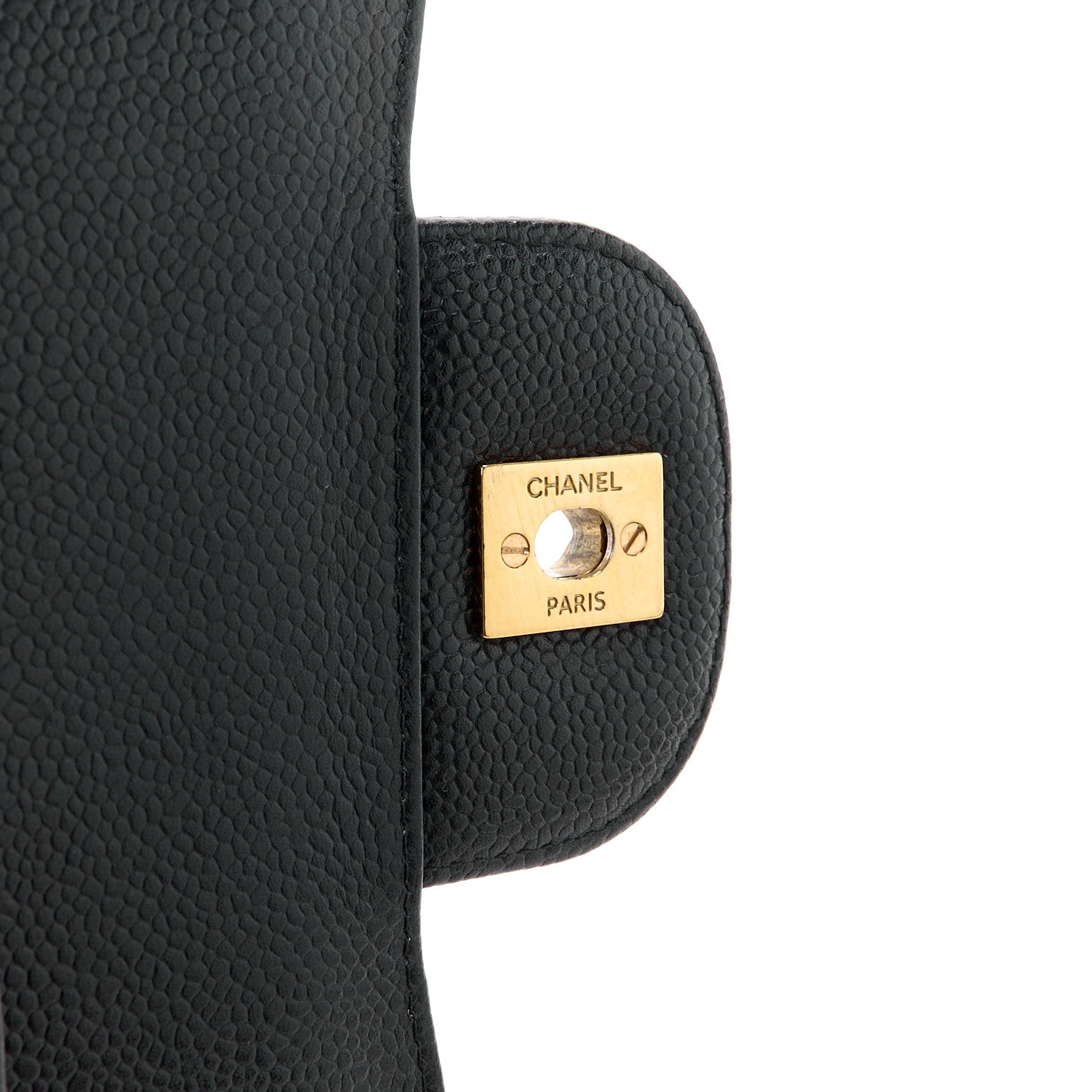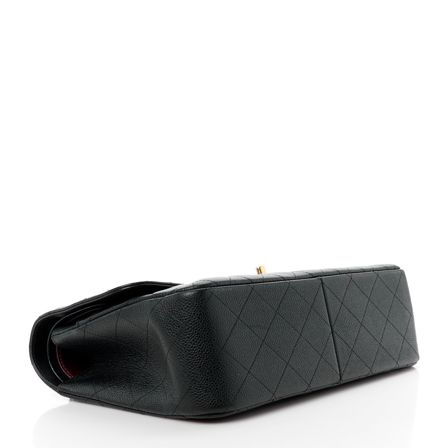 This is an authentic CHANEL Caviar Quilted Jumbo Double Flap in Black. This shoulder bag is crafted of luxurious black calfskin leather with iconic diamond quilting. The bag has a polished gold chain shoulder strap threaded with black leather and a gold Chanel CC turn-lock. This opens the front flap to reveal an inner flap and a burgundy leather interior with patch pockets.