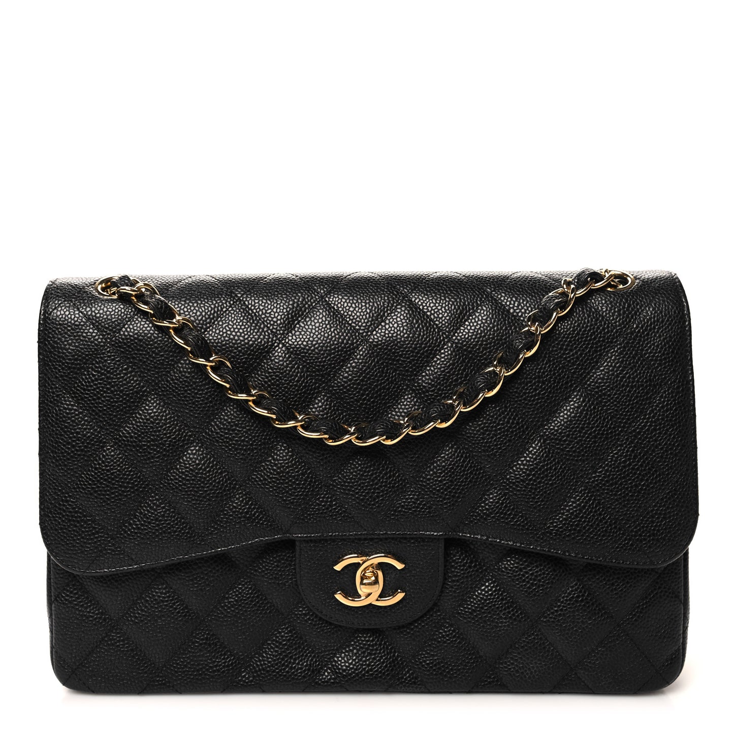 This is an authentic CHANEL Caviar Quilted Jumbo Double Flap in Black. This stylish shoulder bag is crafted of luxurious diamond-quilted caviar leather in black. It features a leather-threaded polished gold-tone chain-link shoulder strap and a rear patch pocket. The crossover flap opens with a gold-tone classic CC turn-lock to reveal an inner flap, front pocket, and a burgundy leather interior with patch pockets.Follow this item for alerts. Chanel is a registered trademark of Chanel. FASHIONPHILE is not affiliated with Chanel.
