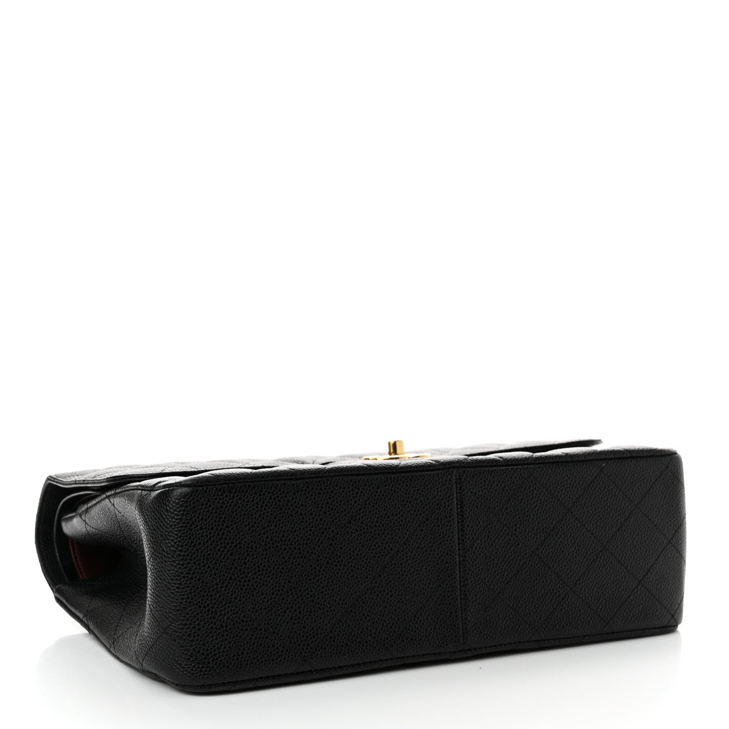 This is an authentic CHANEL Caviar Quilted Jumbo Double Flap in Black. This stylish shoulder bag is crafted of luxurious caviar textured leather. It features leather threaded polished gold chain link shoulder straps, a rear patch pocket, and a front flap with a gold CC turn lock. The flap opens to an inner flap and a bordeaux leather interior with patch pockets.Follow this item for alerts. Chanel is a registered trademark of Chanel. FASHIONPHILE is not affiliated with Chanel.