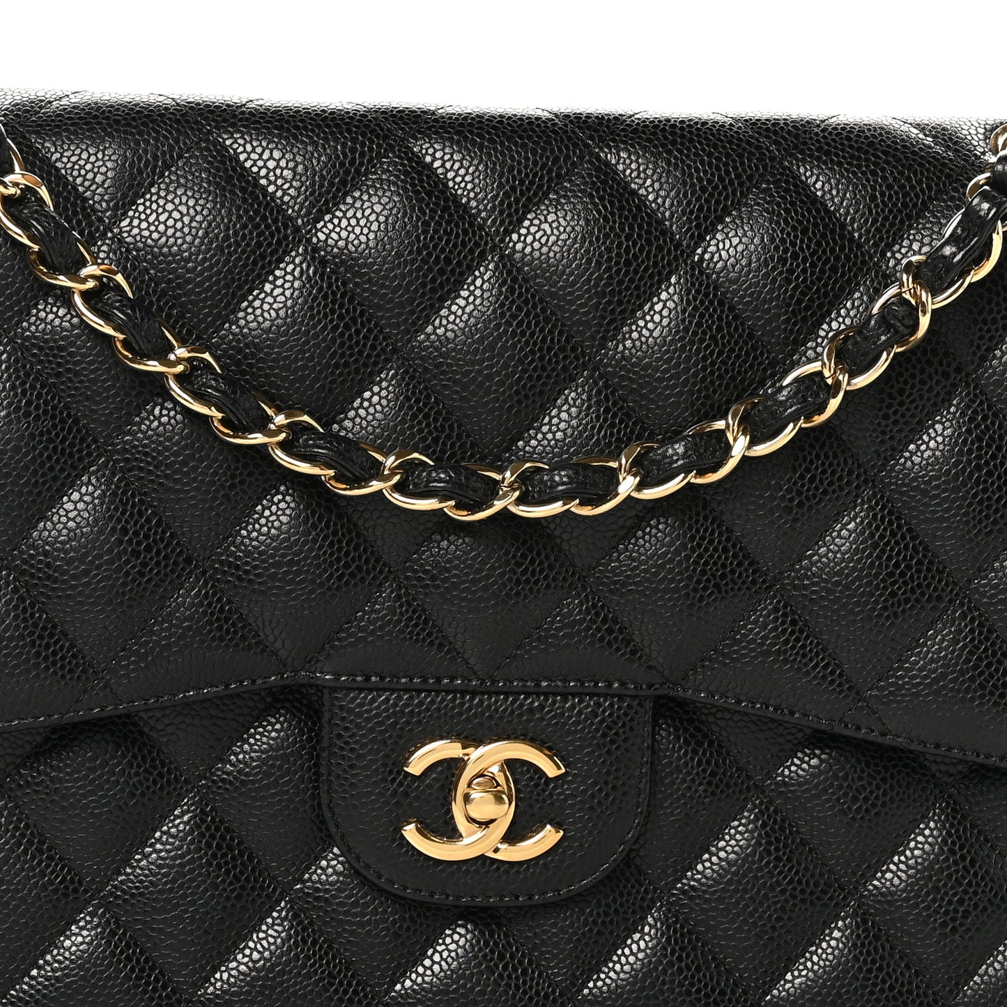 This is an authentic CHANEL Caviar Quilted Jumbo Double Flap in Black. This stylish shoulder bag is crafted of luxurious caviar textured leather. It features leather threaded polished gold chain link shoulder straps, a rear patch pocket, and a front flap with a gold CC turn lock. The flap opens to an inner flap and a bordeaux leather interior with patch pockets.Follow this item for alerts. Chanel is a registered trademark of Chanel. FASHIONPHILE is not affiliated with Chanel.