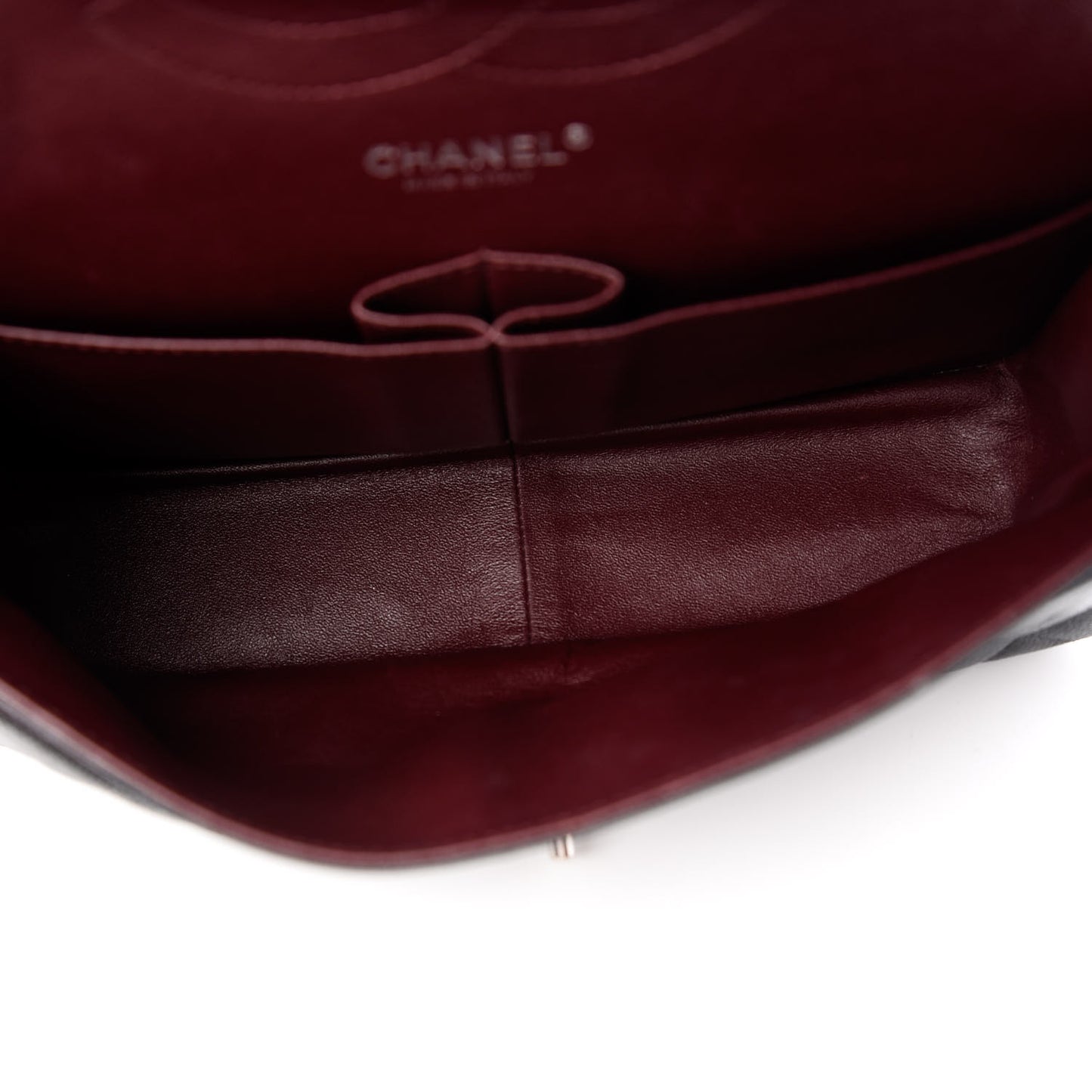 This is an authentic CHANEL Caviar Quilted Jumbo Double Flap in Black. This stylish shoulder bag is crafted of luxurious diamond-quilted caviar leather in black. It features a leather-threaded polished silver chain-link shoulder strap and a rear patch pocket. The crossover flap opens with a silver classic CC turn-lock to reveal an inner flap, front pocket, and a burgundy leather interior with patch pockets.Follow this item for alerts. Chanel is a registered trademark of Chanel. FASHIONPHILE is not affiliated with Chanel.