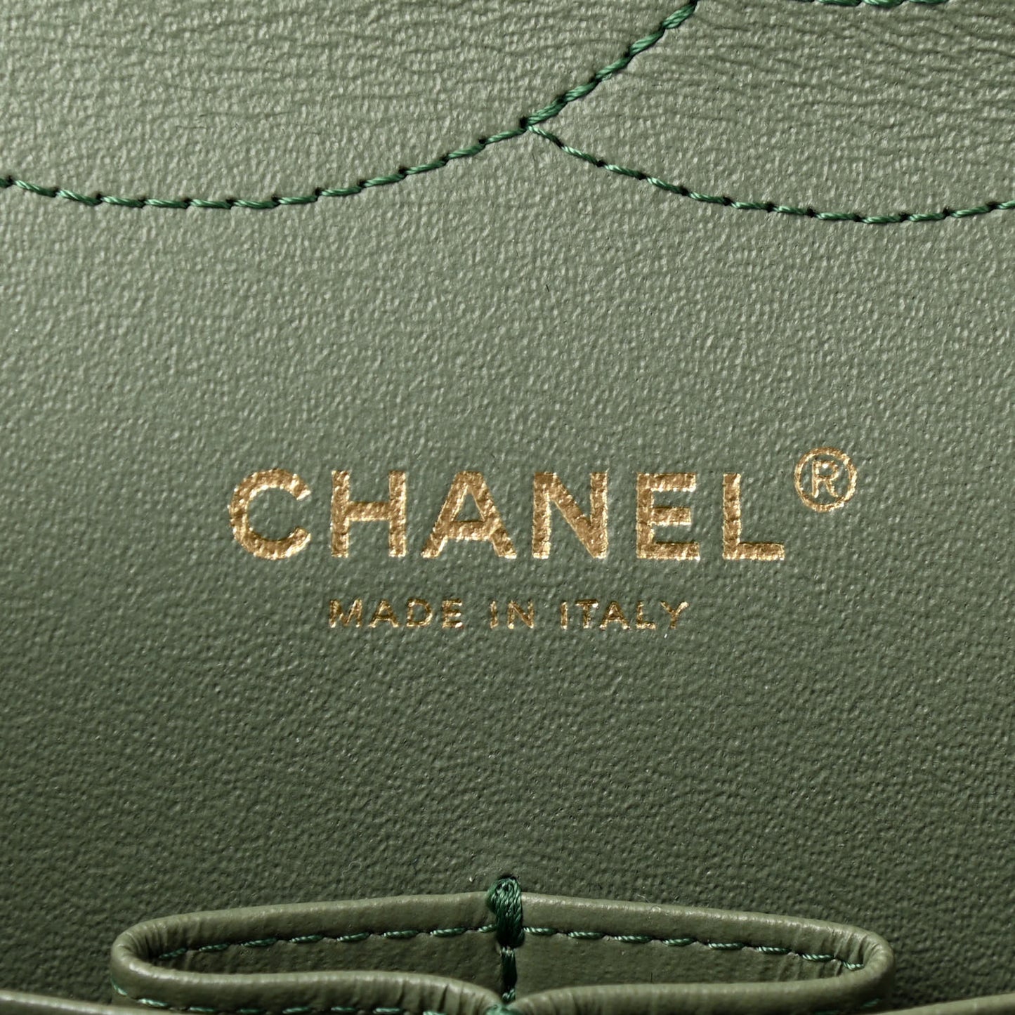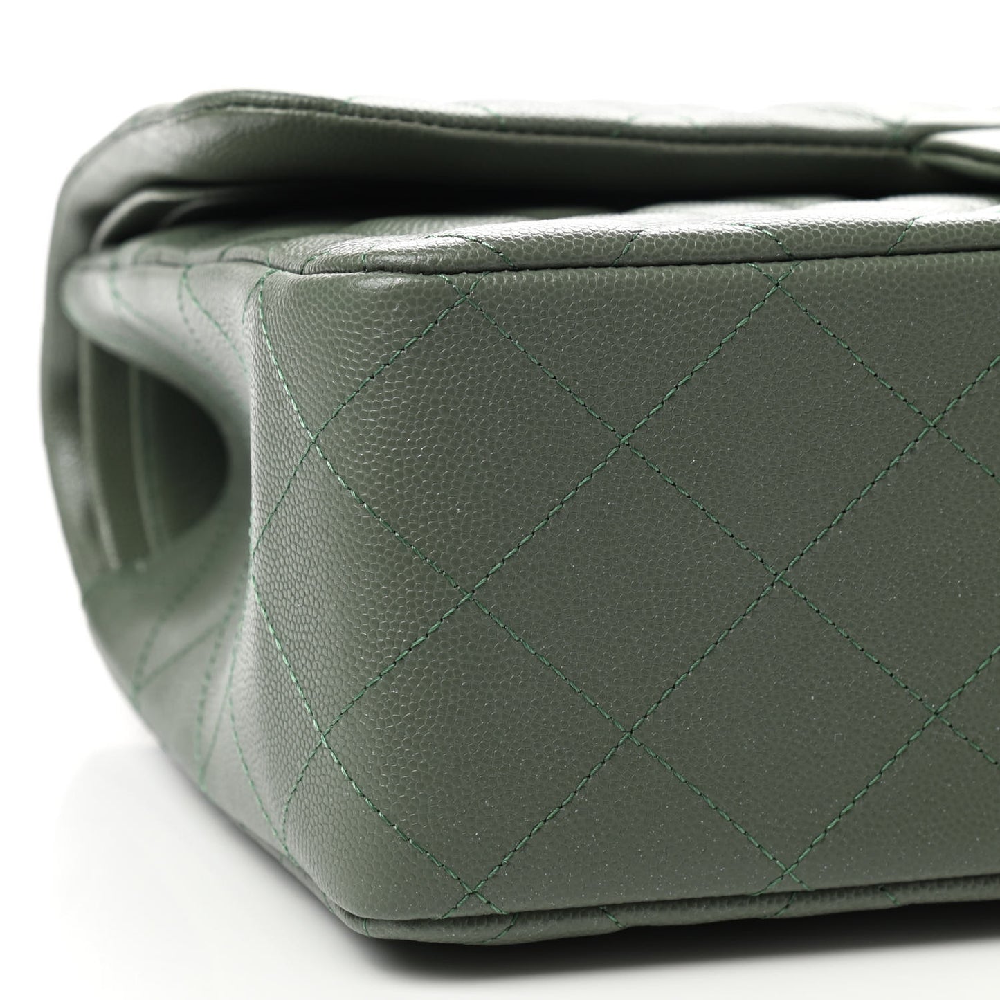 This is an authentic CHANEL Caviar Quilted Jumbo Double Flap in Dark Green. This stunning shoulder bag is crafted of luxurious diamond quilted caviar leather in a beautiful shade of sage green. The bag features a polished light gold chain-link leather-threaded shoulder strap and a front flap with a light gold Chanel CC turn-lock closure. This opens to reveal an inner flap and a matching leather interior with patch pockets.Follow this item for alerts. Chanel is a registered trademark of Chanel. FASHIONPHILE is not affiliated with Chanel.