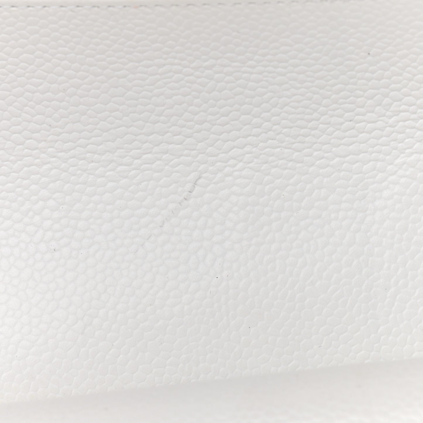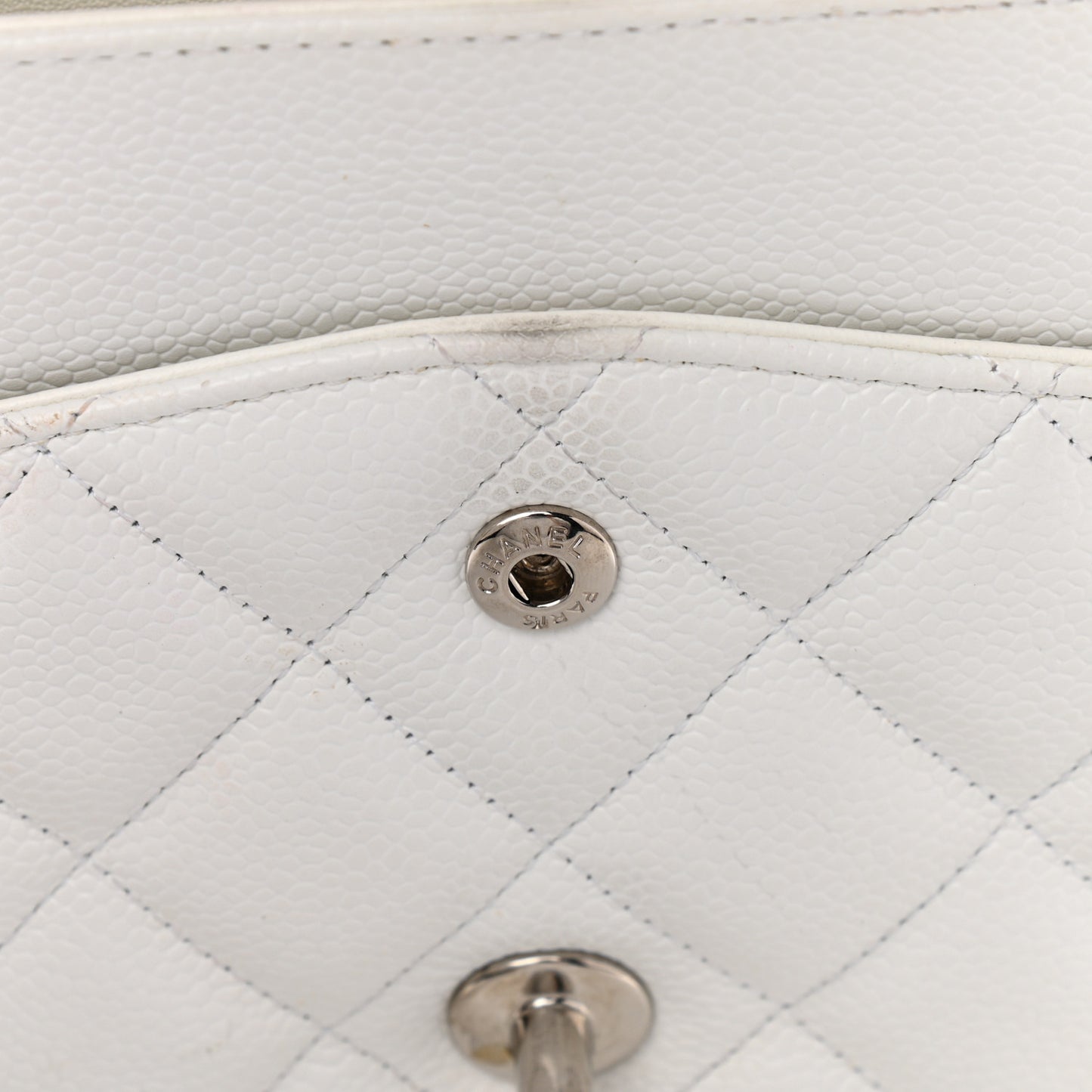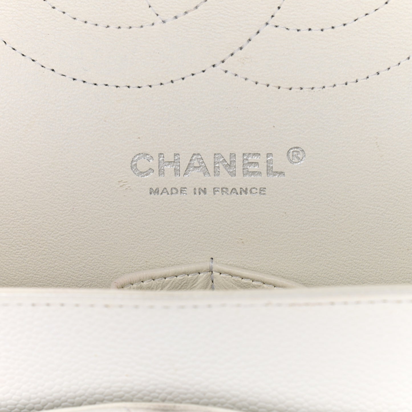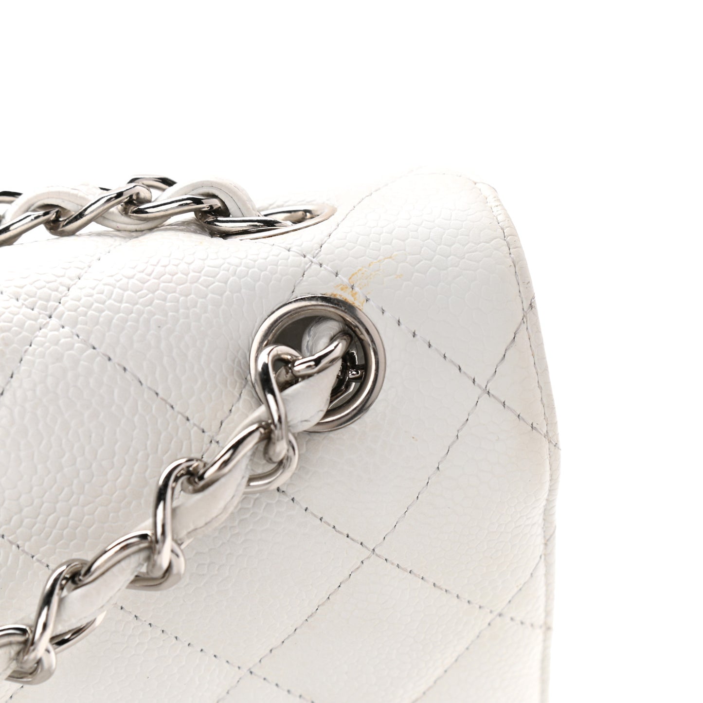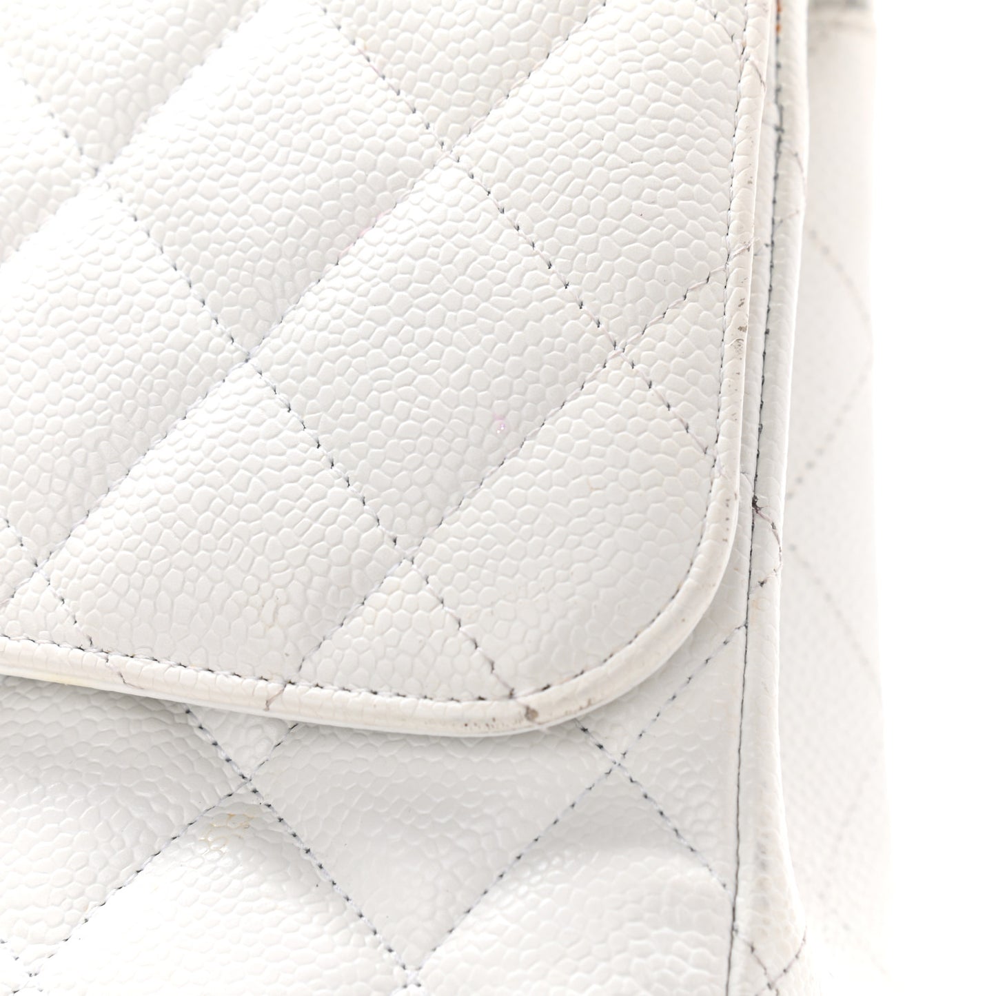 This is an authentic CHANEL Caviar Quilted Jumbo Double Flap in White. This stunning large flap bag is finely crafted of diamond quilted luxurious caviar leather in white. The handbag features silver chain-link shoulder straps threaded with leather, a facing flap, and a silver Chanel CC turn lock. This opens to an inner flap and matching leather interior with patch pockets.Follow this item for alerts. Chanel is a registered trademark of Chanel. FASHIONPHILE is not affiliated with Chanel.