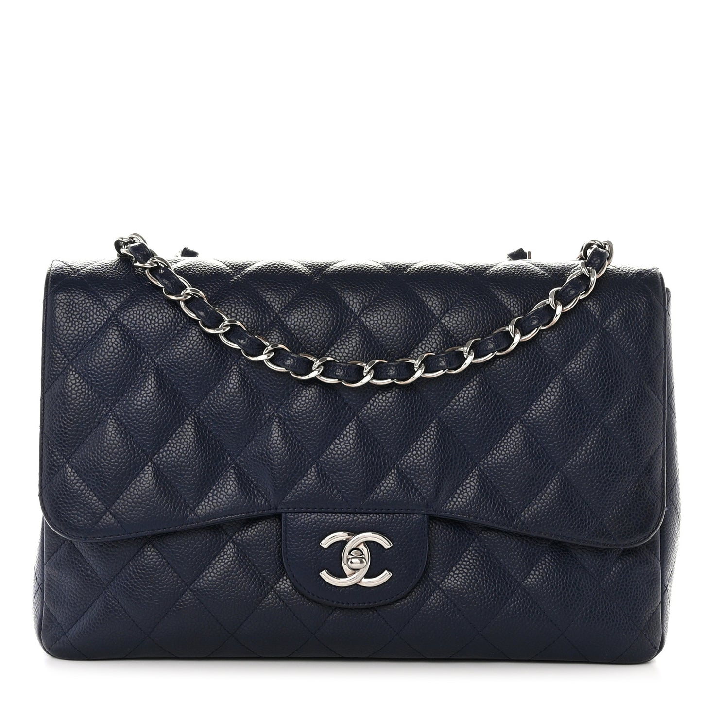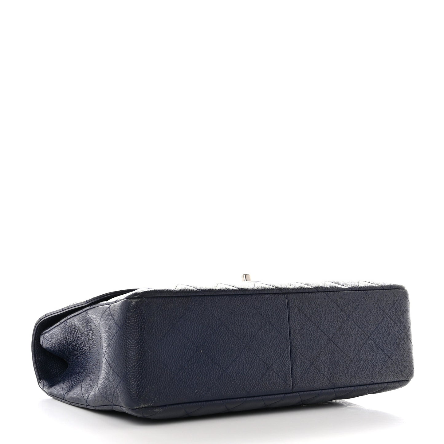 This is an authentic CHANEL Caviar Quilted Jumbo Single Flap in Navy. This classic handbag is crafted of diamond quilted caviar leather in blue. This shoulder bag features a silver chain link leather threaded shoulder strap, a rear patch pocket, and a silver Chanel CC turn lock. This stylish shoulder bag opens to a spacious blue leather interior with zipper and patch pockets.Follow this item for alerts. Chanel is a registered trademark of Chanel. FASHIONPHILE is not affiliated with Chanel.