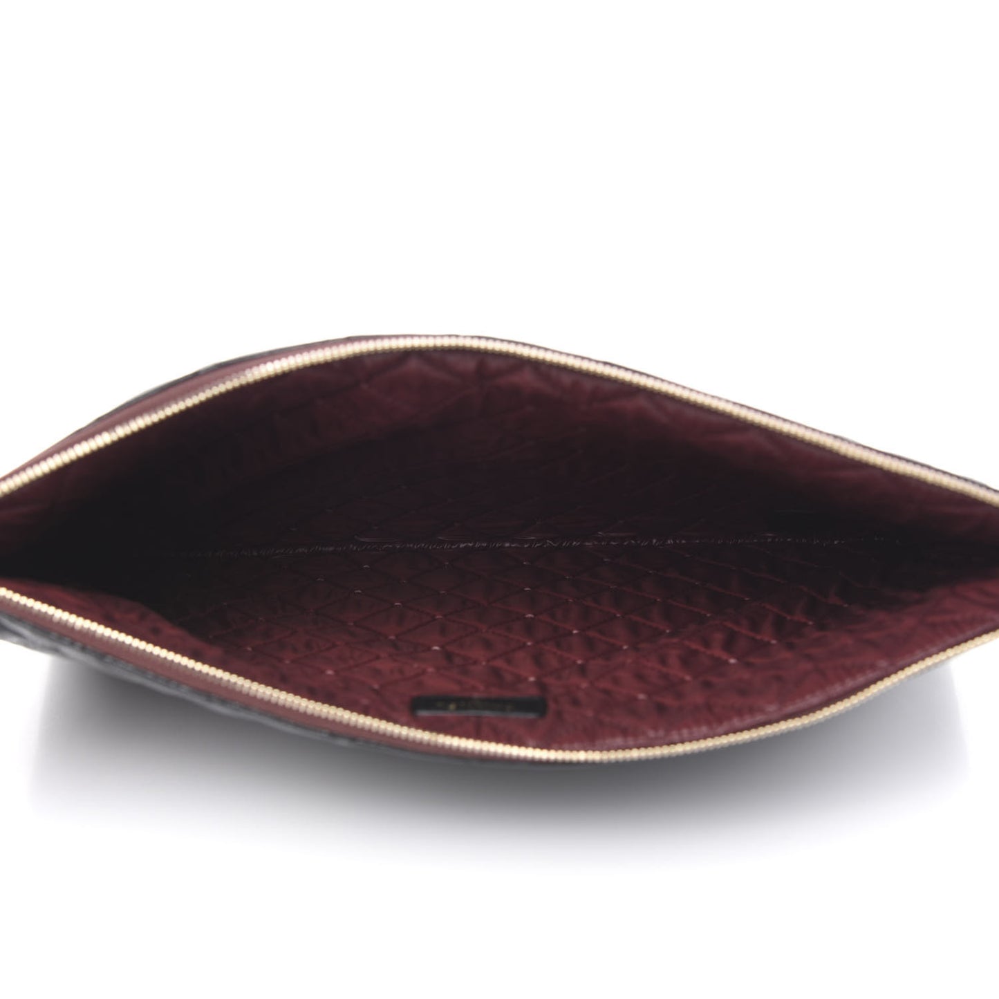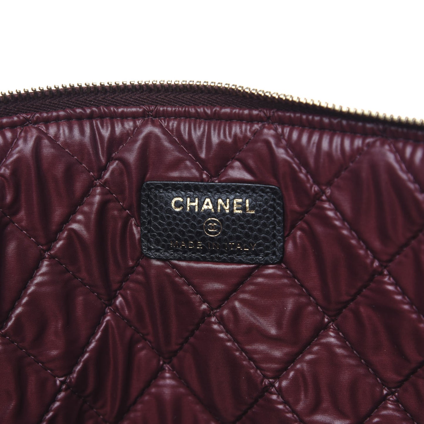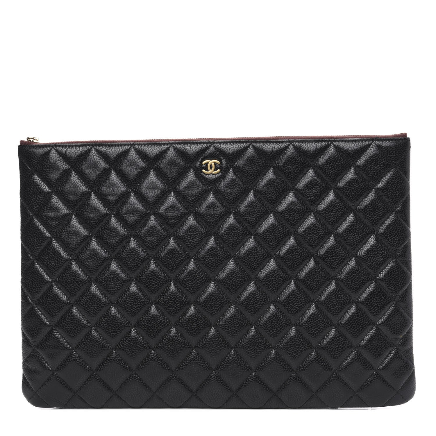 This is an authentic CHANEL Caviar Quilted Large Cosmetic Case in Black. This stylish large cosmetic pouch is crafted of shiny diamond quilted caviar leather in black with a small polished aged gold Chanel CC embellishment at the top. The top zipper opens to a spacious burgundy nylon interior.Follow this item for alerts. Chanel is a registered trademark of Chanel. FASHIONPHILE is not affiliated with Chanel.