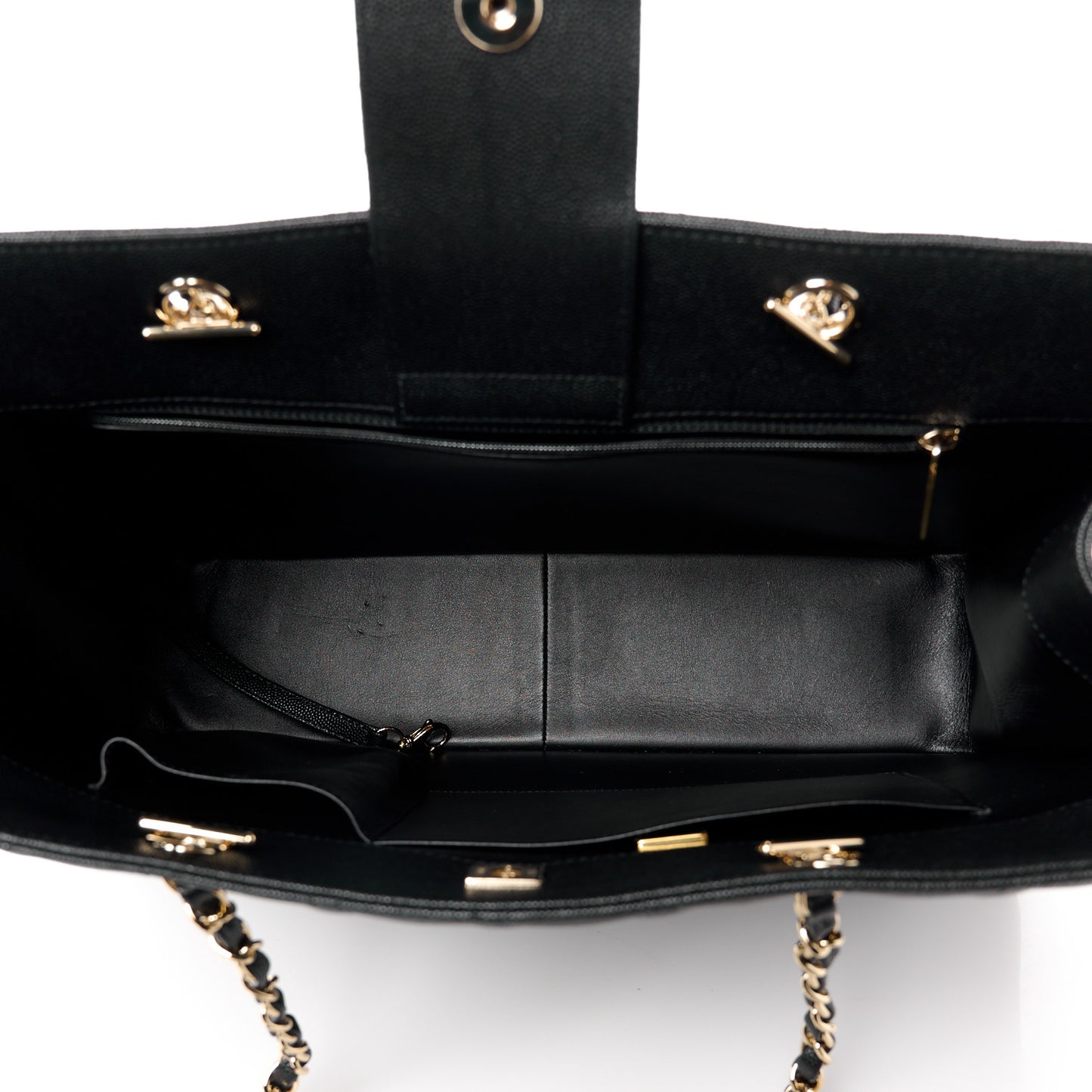 This is an authentic CHANEL Caviar Quilted Large Shopping Tote Black. This large classic tote is crafted of textured caviar diamond quilted calfskin leather in black. It features light gold chain link leather threaded shoulder straps, a light gold Chanel CC turn lock on the front and a spacious rear pocket. The top is open to a black leather interior with zipper and patch pockets.Follow this item for alerts. Chanel is a registered trademark of Chanel. FASHIONPHILE is not affiliated with Chanel.