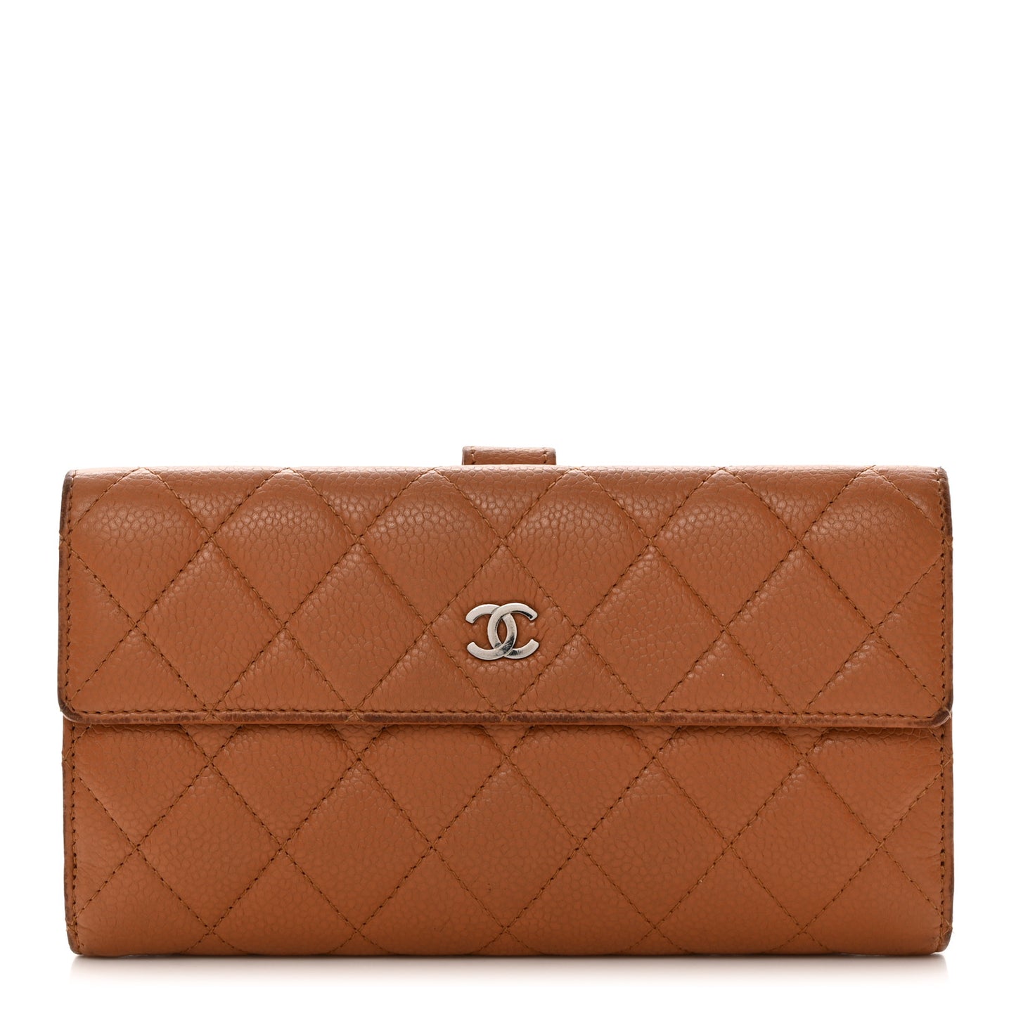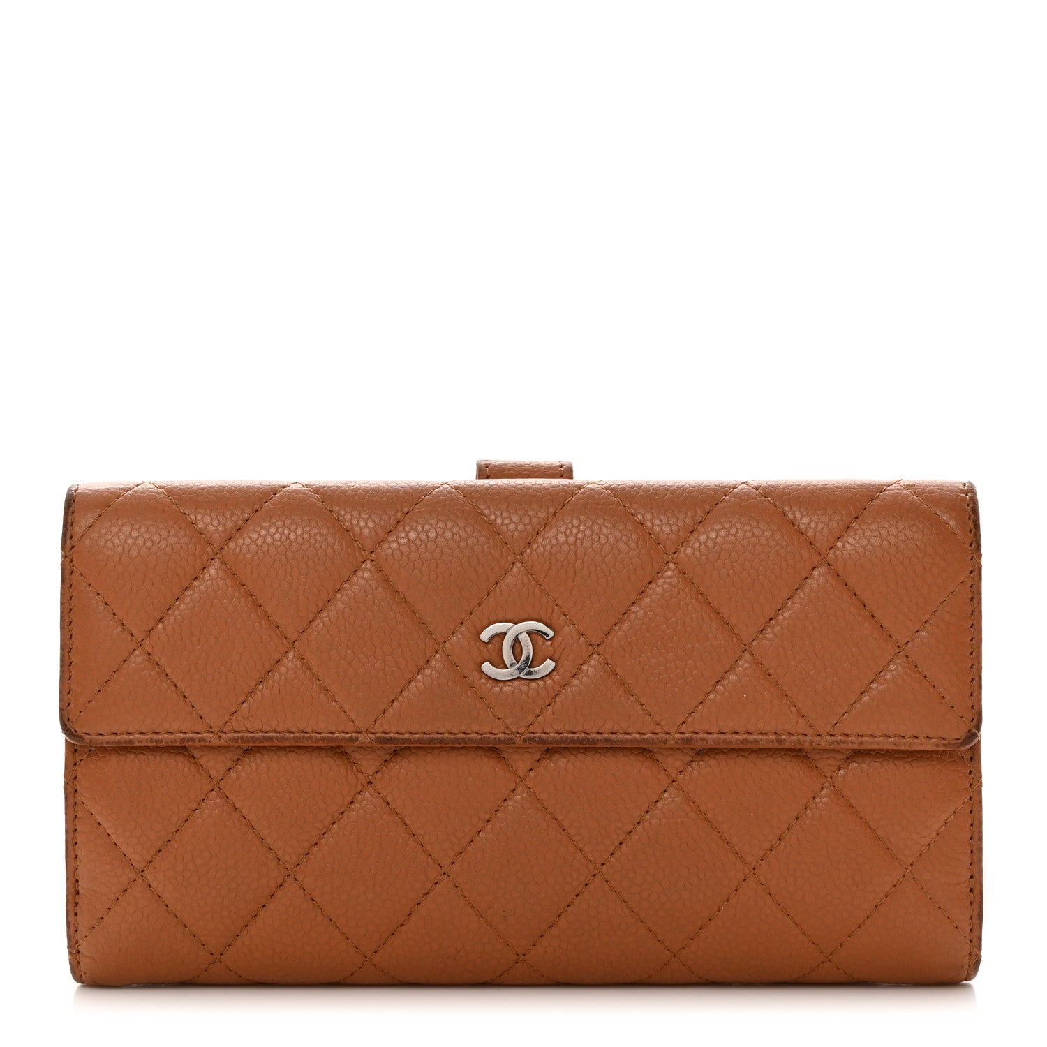 This is an authentic CHANEL Caviar Quilted Long Flap Wallet in Light Brown. This stylish wallet is crafted of diamond quilted brown caviar leather with a small Chanel CC logo in silver. The front flap opens to a partitioned brown fabric interior with card slots, patch pockets, and a zipper pocket.Follow this item for alerts. Chanel is a registered trademark of Chanel. FASHIONPHILE is not affiliated with Chanel.