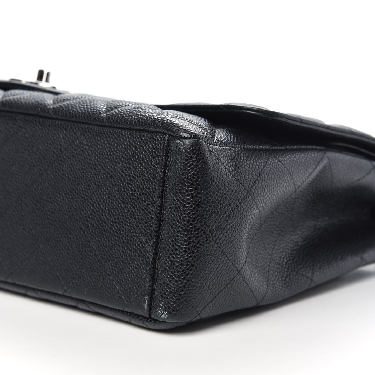 This is an authentic CHANEL Caviar Quilted Maxi Double Flap in Black. This stylish shoulder bag is crafted of luxurious caviar textured leather in black. It features leather threaded polished silver chain link shoulder straps, a rear patch pocket and a front flap with a silver Classic CC turn lock. The flap opens to an inner flap and a spacious burgundy leather interior with patch pockets.