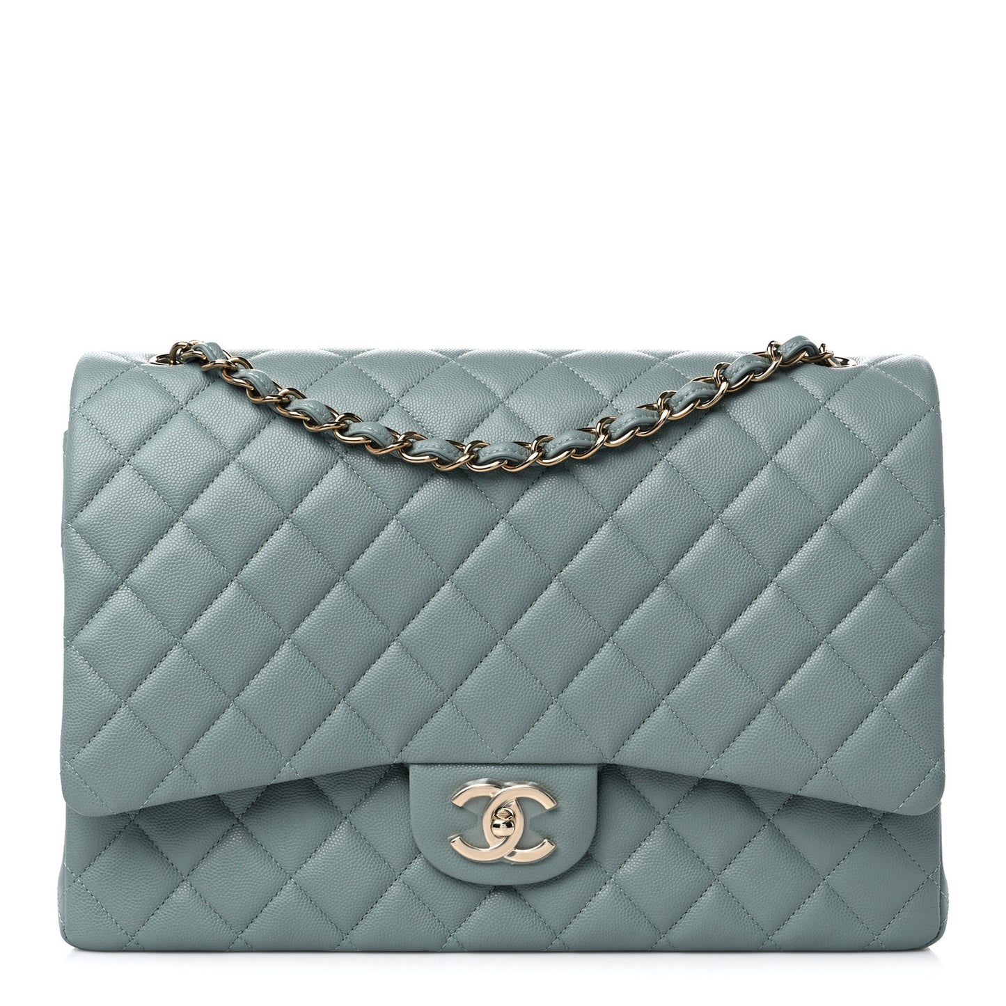 This is an authentic CHANEL Caviar Quilted Maxi Double Flap in Dark Green. This elegant maxi flap bag is finely crafted of diamond quilted caviar leather in green. The bag features polished gold chain shoulder straps threaded with matching leather, a rear patch pocket, and a front flap with a gold CC turn lock. The flap opens to a matching leather interior with patch pockets.Follow this item for alerts. Chanel is a registered trademark of Chanel. FASHIONPHILE is not affiliated with Chanel.