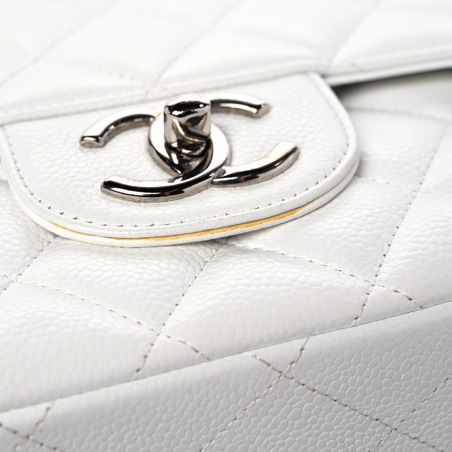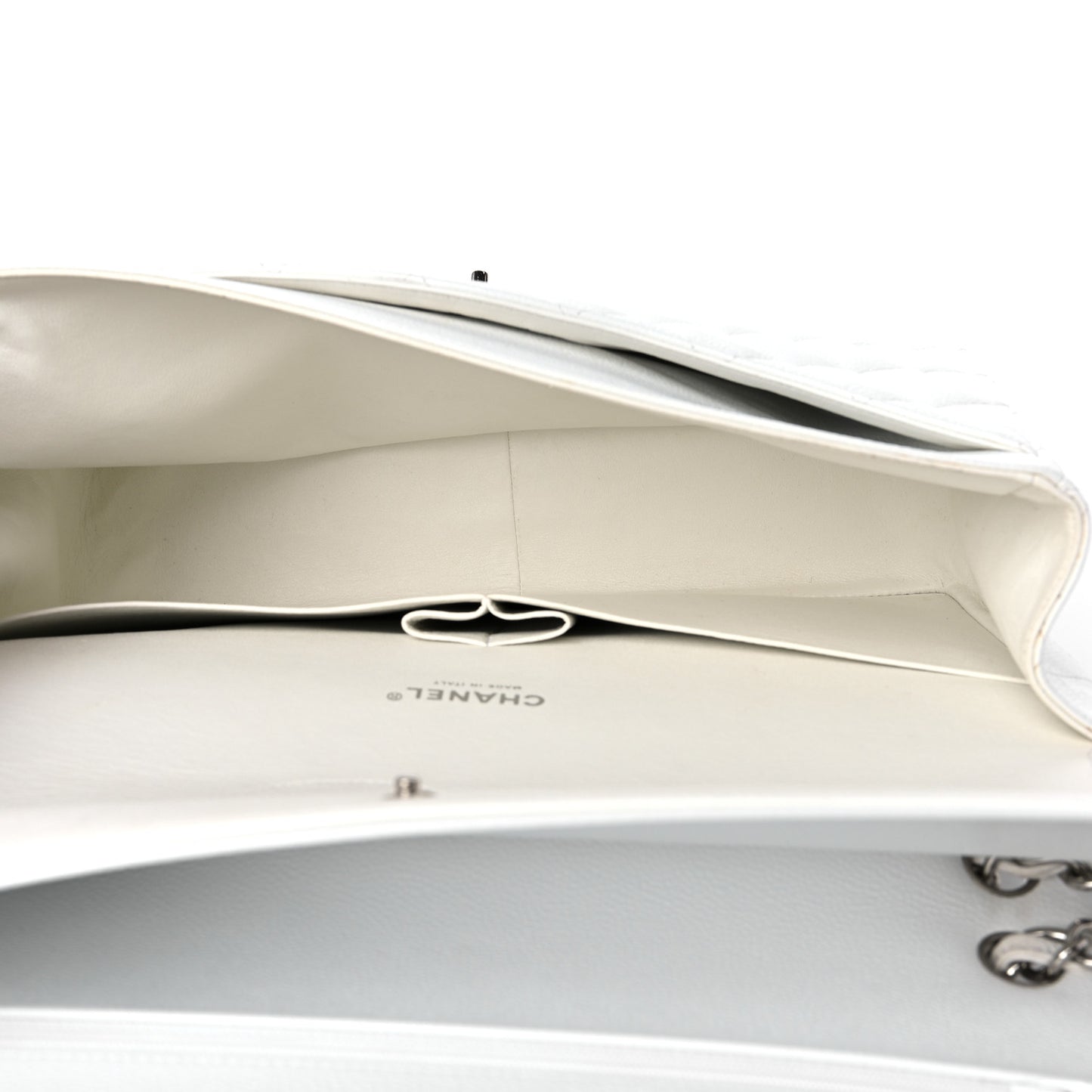 This is an authentic CHANEL Caviar Quilted Maxi Double Flap in White. This stunning large flap bag is finely crafted of diamond quilted luxurious caviar leather in white. The bag features silver chain link shoulder straps threaded with leather, a frontal flap and a silver Chanel CC turn lock. This opens to a matching leather interior with patch pockets.Follow this item for alerts. Chanel is a registered trademark of Chanel. FASHIONPHILE is not affiliated with Chanel.