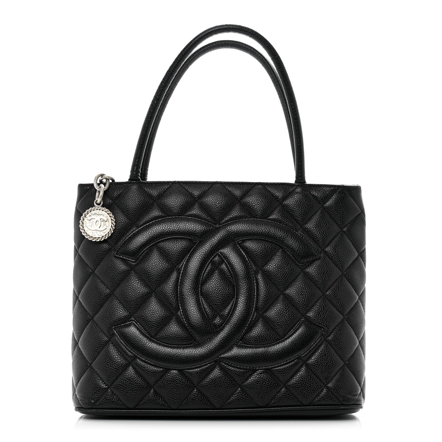 This is an authentic CHANEL Caviar Quilted Medallion Tote in Black. This stylish tote is beautifully crafted of diamond-quilted caviar leather in black with a prominent Chanel CC logo patch on the front. The bag features a rear patch pocket and rolled leather top handles. The brushed silver medallion zipper pull opens the bag to a smooth black leather interior with zipper and patch pockets.Follow this item for alerts. Chanel is a registered trademark of Chanel. FASHIONPHILE is not affiliated with Chanel.
