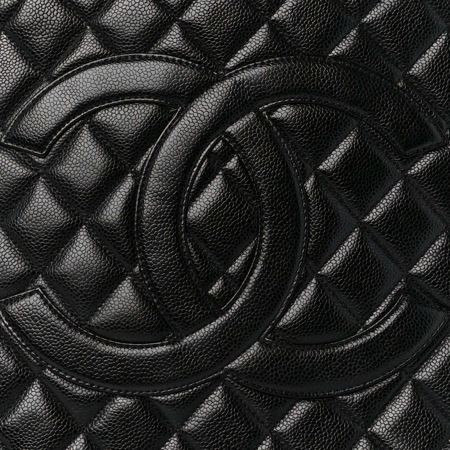 This is an authentic CHANEL Caviar Quilted Medallion Tote in Black. This stylish tote is beautifully crafted of diamond-quilted caviar leather in black with a prominent Chanel CC logo patch on the front. The bag features a rear patch pocket and rolled leather top handles. The gold medallion zipper pull opens the bag to a smooth black leather interior with zipper and patch pockets.Follow this item for alerts. Chanel is a registered trademark of Chanel. FASHIONPHILE is not affiliated with Chanel.