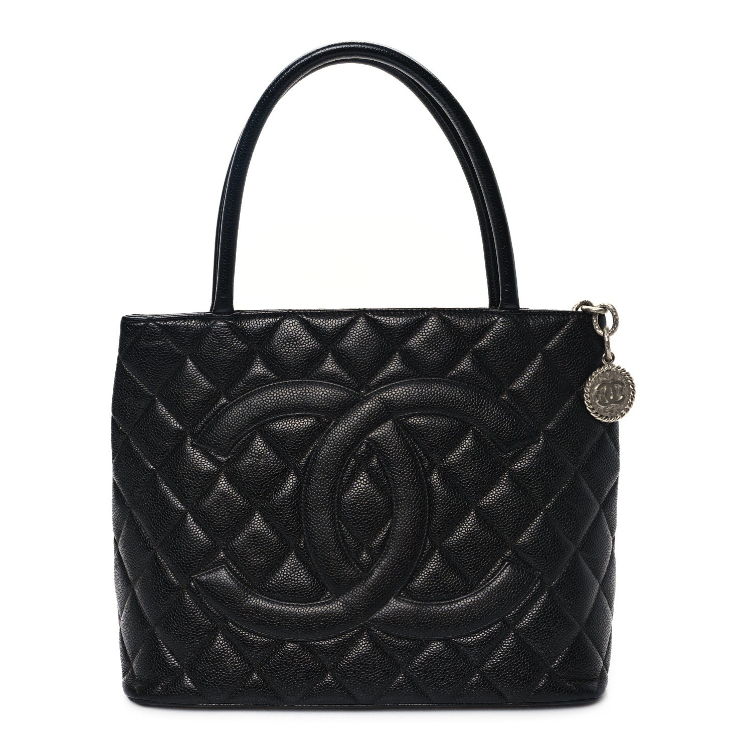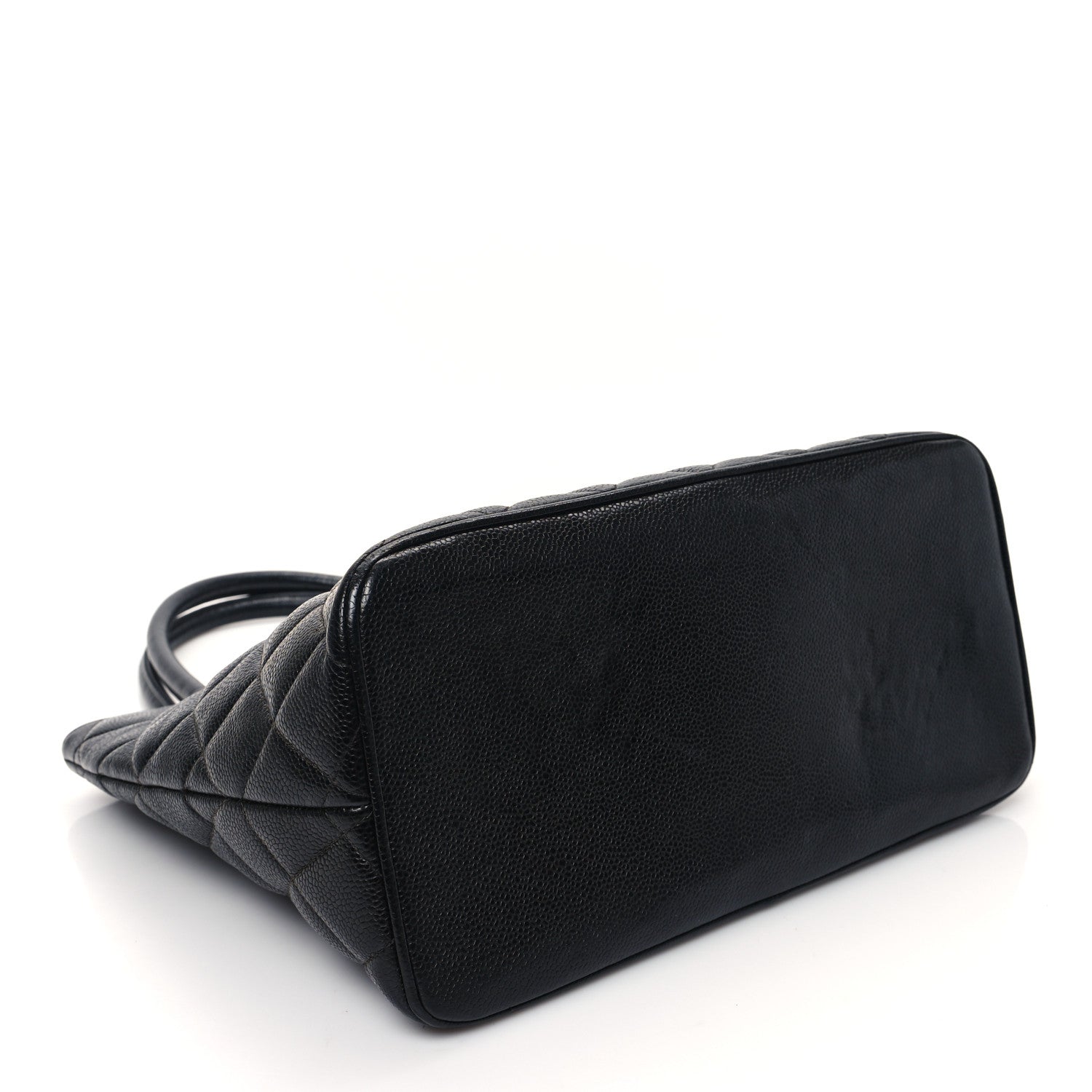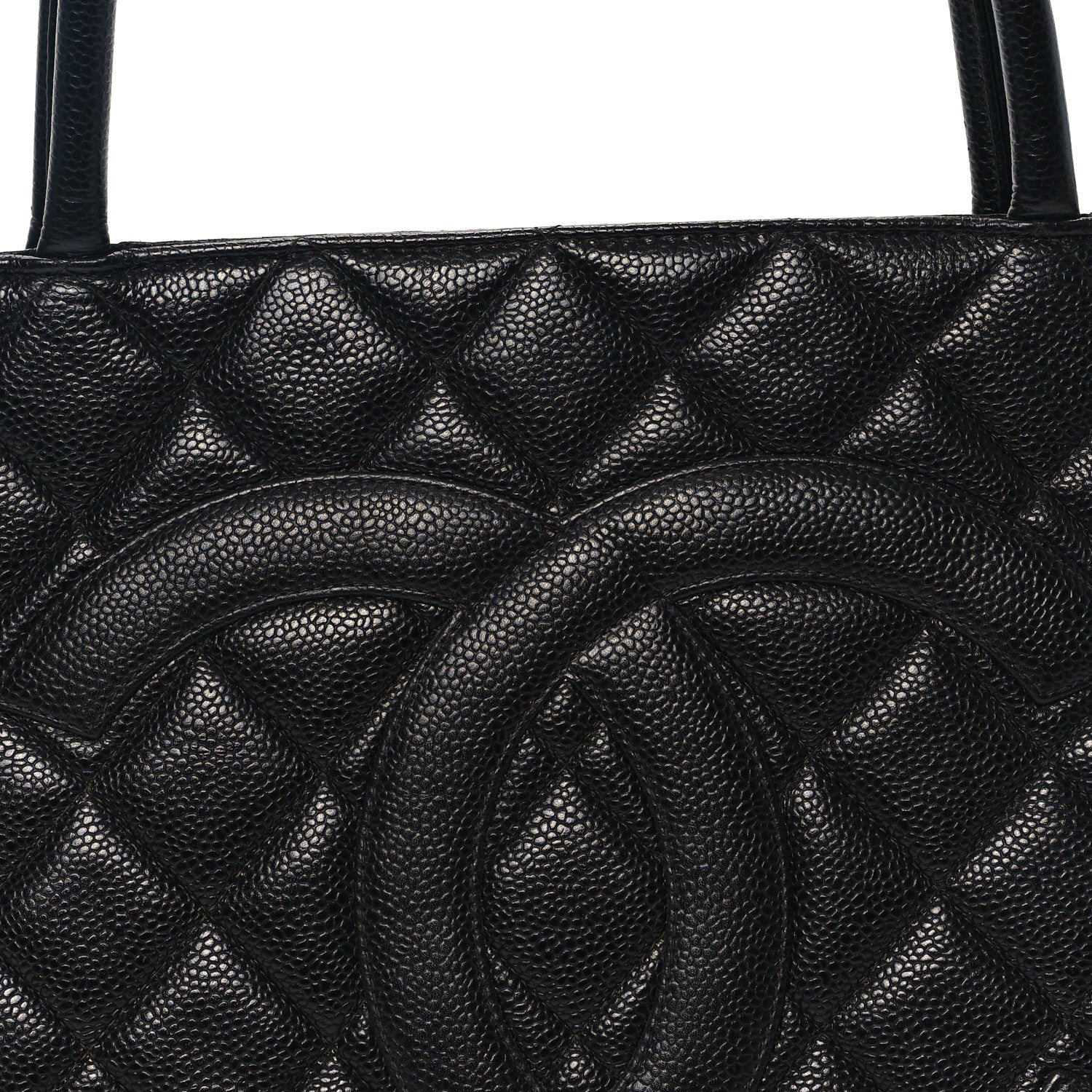 This is an authentic CHANEL Caviar Quilted Medallion Tote in Black. This stylish tote is beautifully crafted of diamond-quilted caviar leather in black with a prominent Chanel CC logo patch on the front. The bag features a rear patch pocket and rolled leather top handles. The brushed silver medallion zipper pull opens the bag to a smooth black leather interior with zipper and patch pockets.Follow this item for alerts. Chanel is a registered trademark of Chanel. FASHIONPHILE is not affiliated with Chanel.