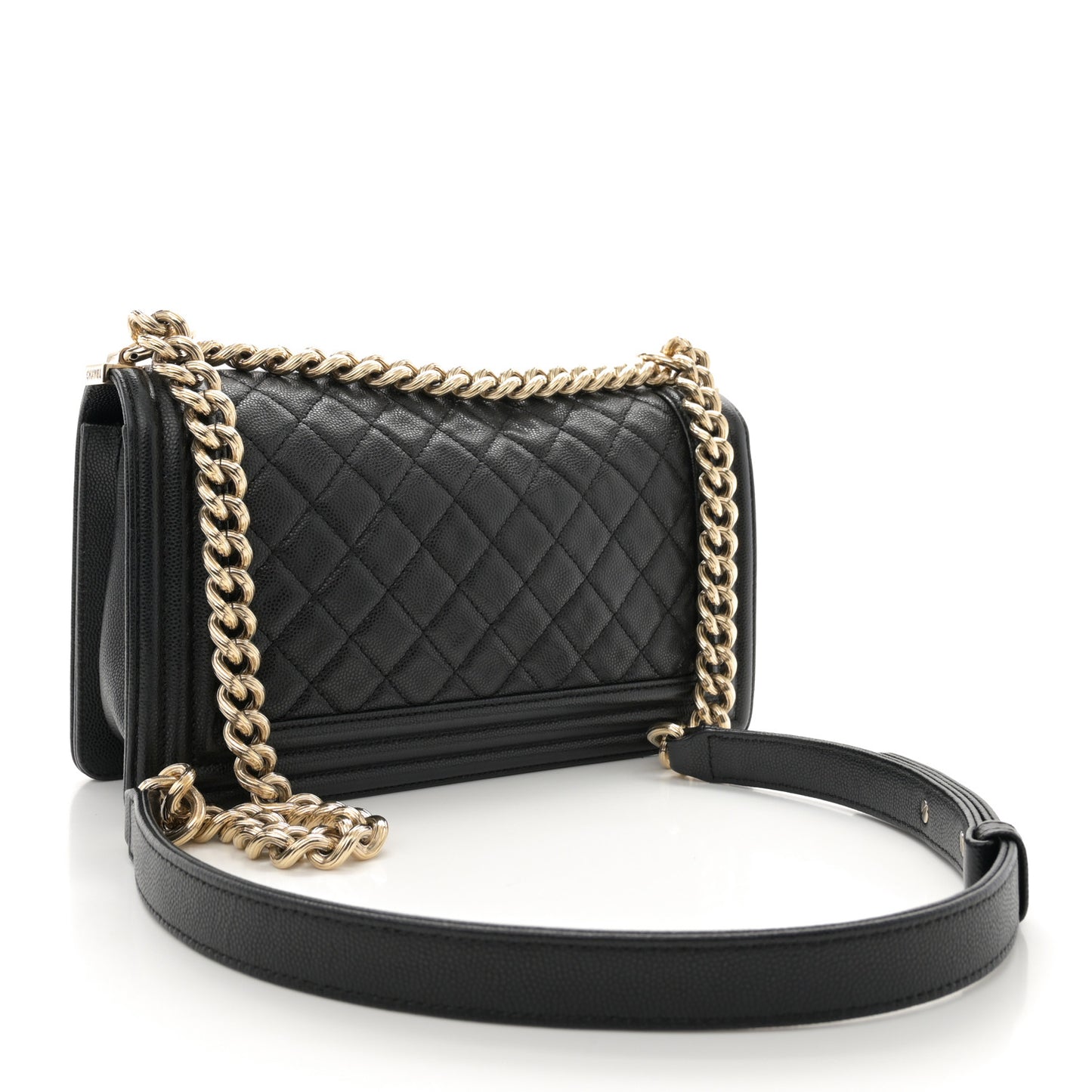This is an authentic CHANEL Caviar Quilted Medium Boy Flap in Black. This chic shoulder bag is crafted of diamond quilted caviar leather with a linear quilted border in black. The bag features a polished gold chain-link shoulder strap with a leather shoulder pad and a polished gold Chanel boy CC push lock. The flap opens to a black fabric interior with a pocket.
