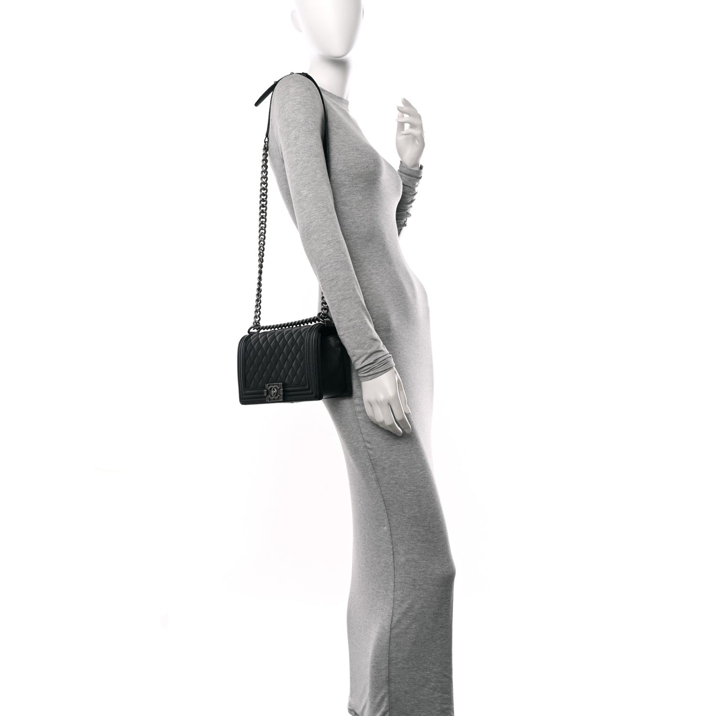 This is an authentic CHANEL Caviar Quilted Medium Boy Flap in Black. This shoulder bag is crafted of caviar leather in black. The bag features a dark silver chain shoulder strap with a leather shoulder pad, a diamond quilted crossover flap with a linear quilted border, and a dark silver boy CC push lock. This opens to a black fabric interior with a patch pocket.Follow this item for alerts. Chanel is a registered trademark of Chanel. FASHIONPHILE is not affiliated with Chanel.
