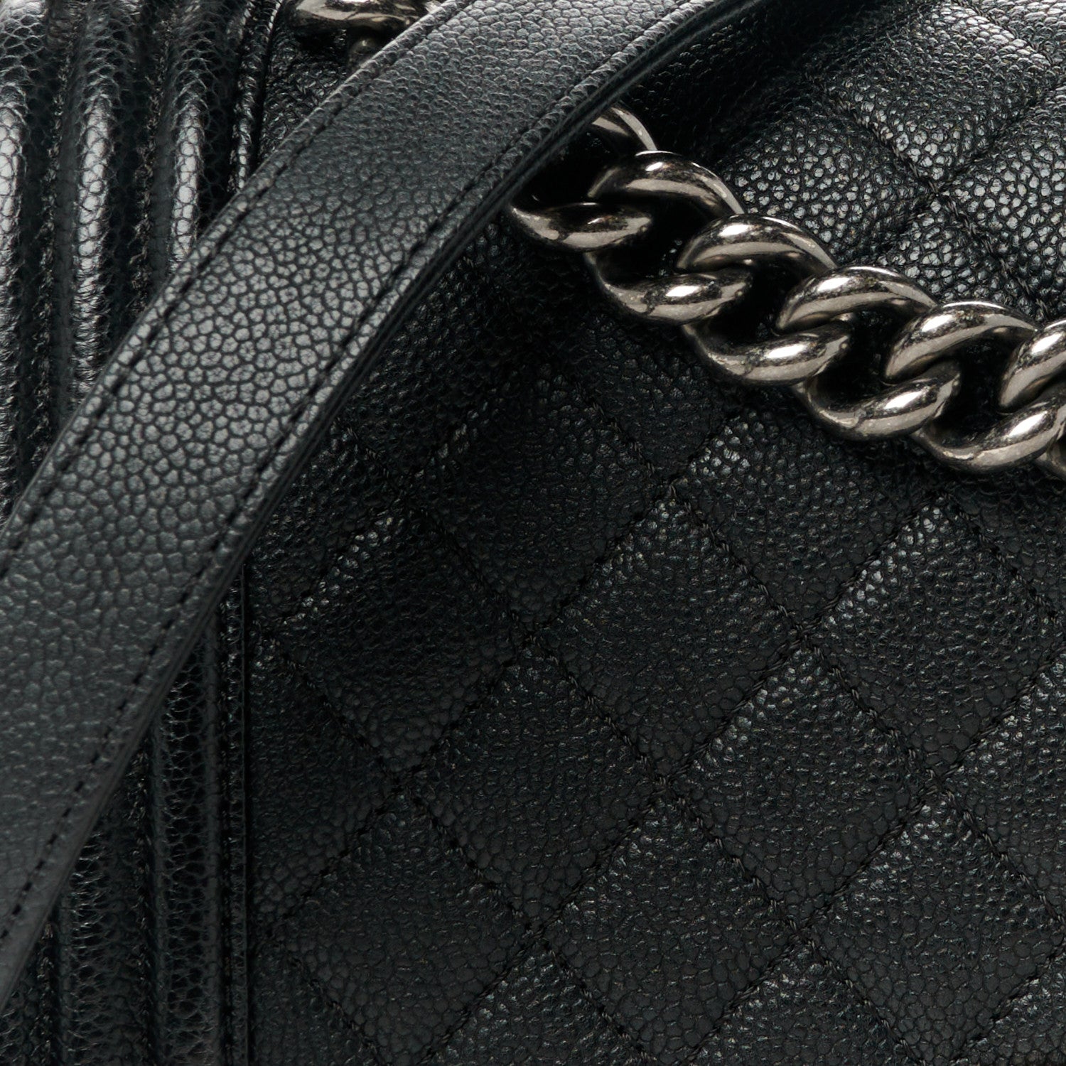 This is an authentic CHANEL Caviar Quilted Medium Boy Flap in Black. This shoulder bag is crafted of caviar leather in black. The bag features a dark silver chain shoulder strap with a leather shoulder pad, a diamond quilted crossover flap with a linear quilted border, and a dark silver boy CC push lock. This opens to a black fabric interior with a patch pocket.