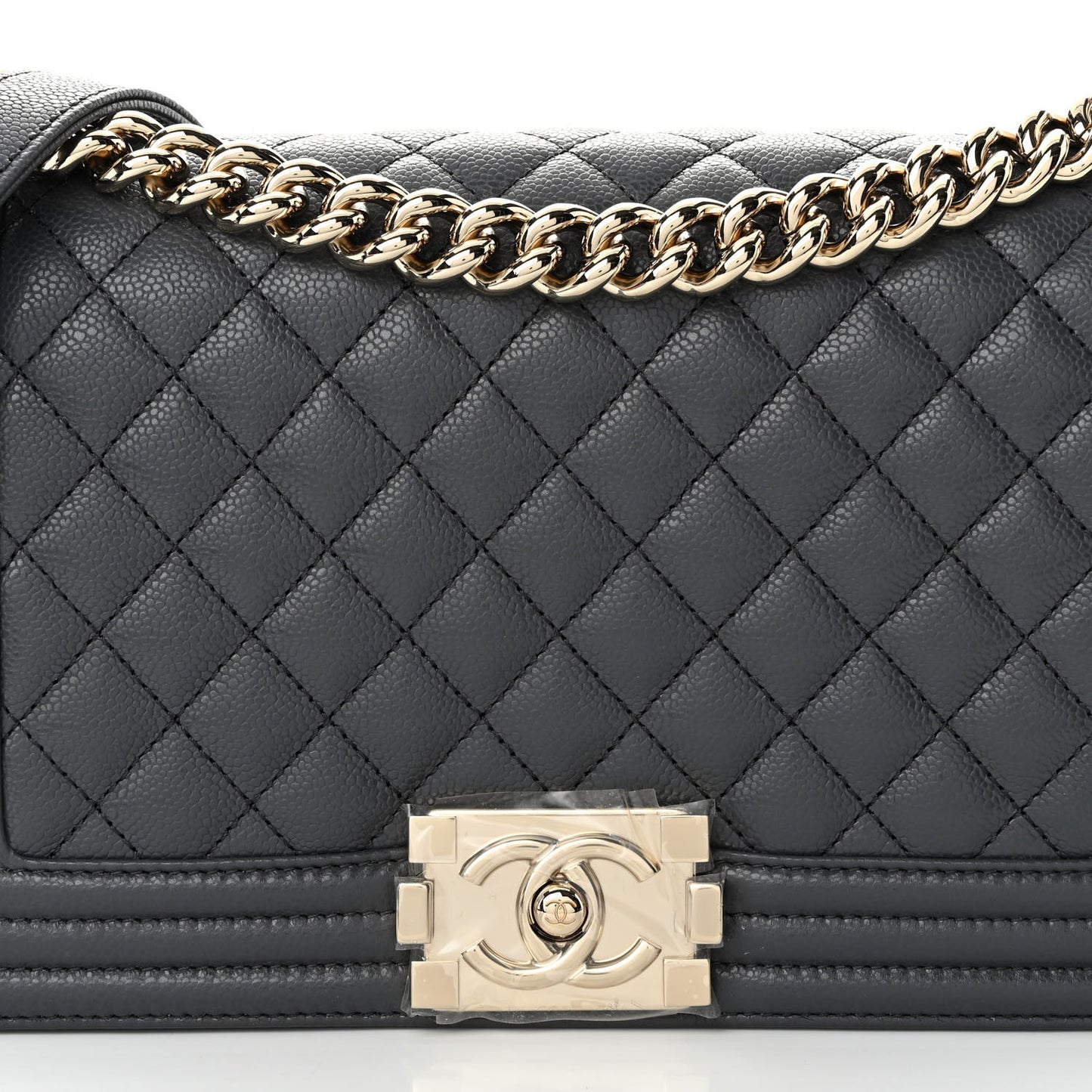 This is an authentic CHANEL Caviar Quilted Medium Boy Flap in Dark Grey. This stylish shoulder bag is crafted of luxuriously textured diamond quilted caviar leather framed by peripheral linear quilting. The bag features a gold below the waist shoulder strap with a leather shoulder pad, and a gold Chanel Boy CC press lock for the facing flap. This opens to a grey leather interior with a patch pocket.Follow this item for alerts. Chanel is a registered trademark of Chanel. FASHIONPHILE is not affiliated with Chanel.
