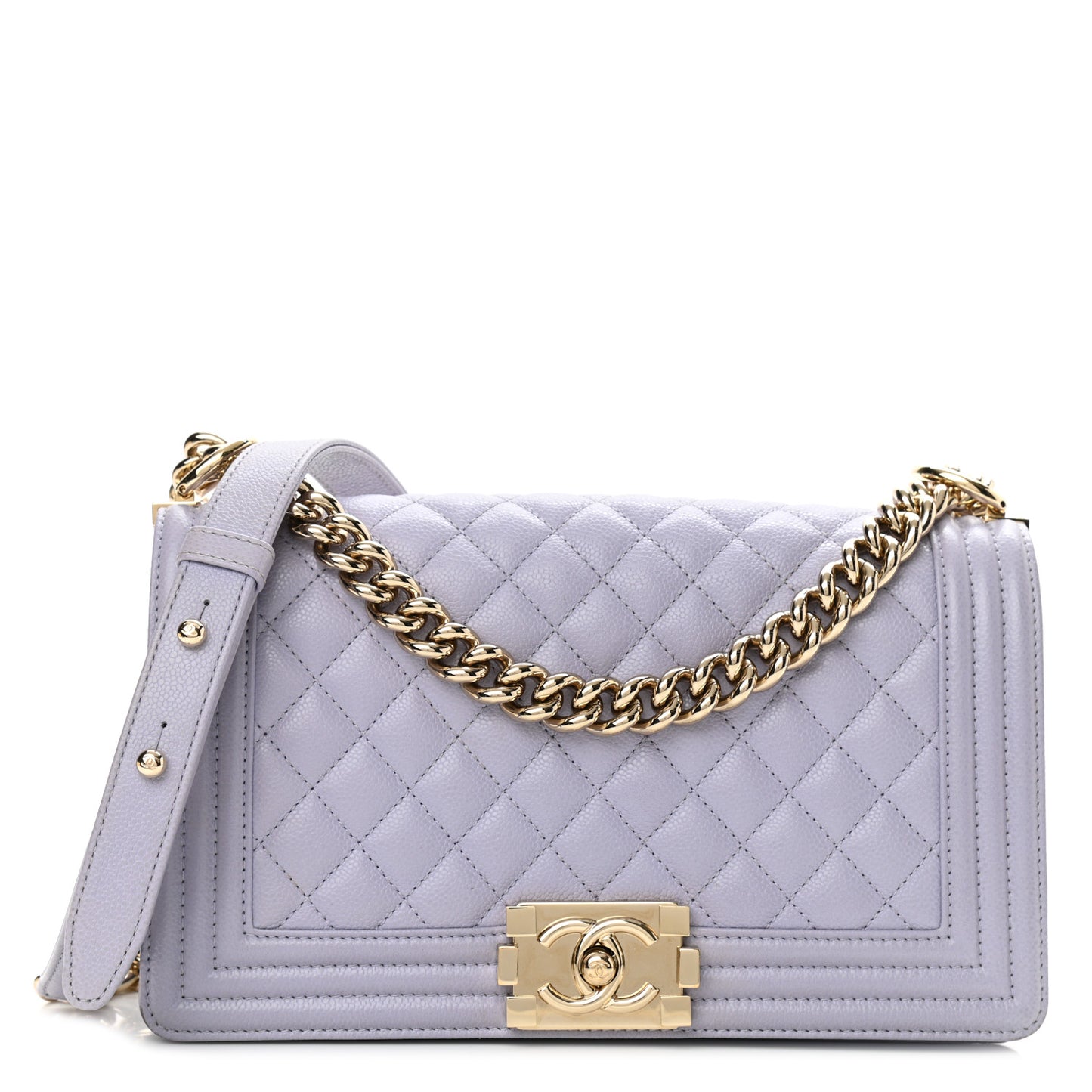This is an authentic CHANEL Caviar Quilted Medium Boy Flap in Light Purple. This stylish shoulder bag is crafted of luxurious diamond quilted caviar leather in light purple framed by linear quilting. It features a gold chain link shoulder strap with a leather shoulder pad and a Chanel boy CC push lock. This opens to a matching fabric interior with a patch pocket.Follow this item for alerts. Chanel is a registered trademark of Chanel. FASHIONPHILE is not affiliated with Chanel.