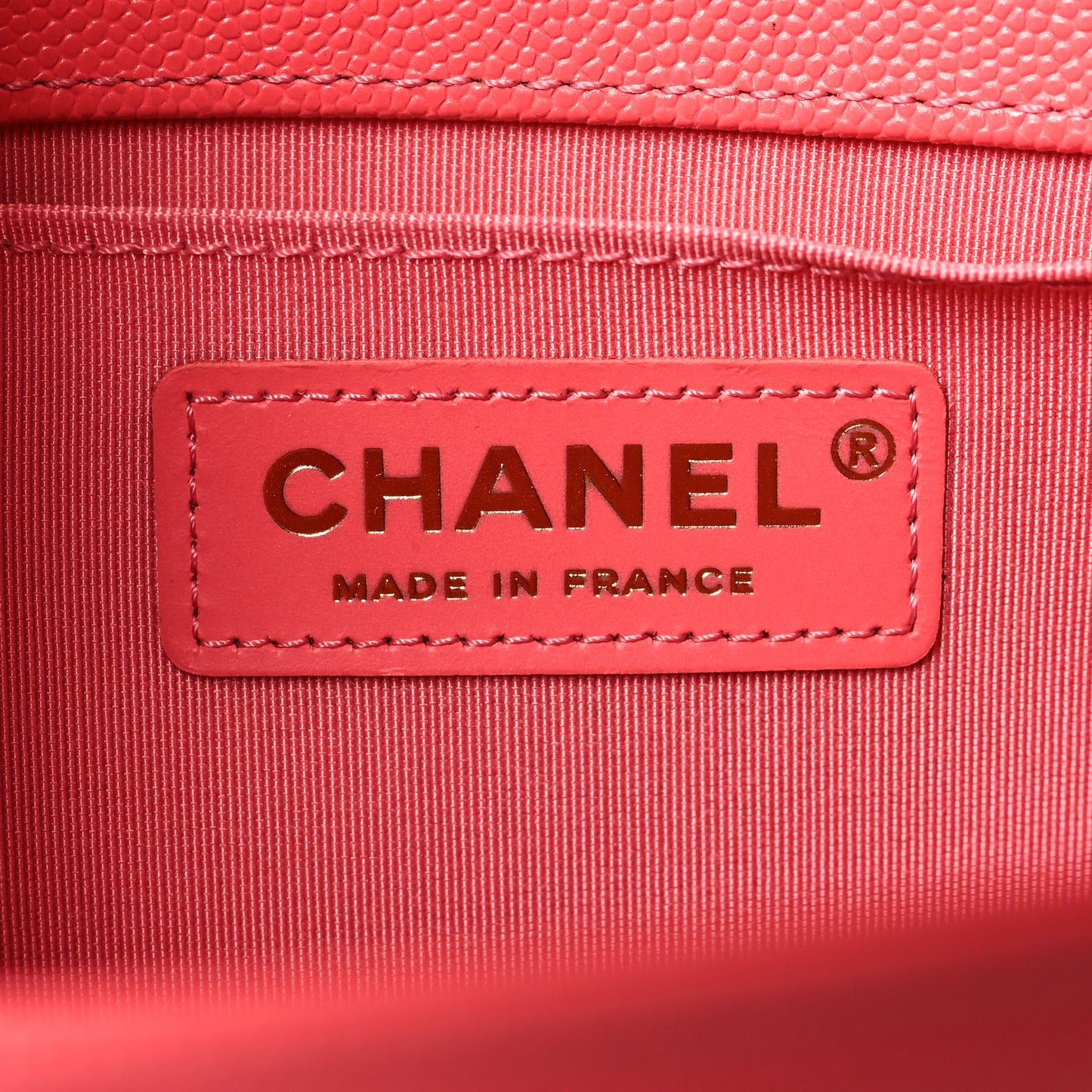 This is an authentic CHANEL Caviar Quilted Medium Boy Flap in Pink. This chic shoulder bag is crafted of luxurious textured diamond quilted caviar leather in a peach color with a border of linear quilted leather. The bag features an aged gold chain-link shoulder strap with a shoulder pad and a unique front squared Chanel CC press lock. The front flap opens to a matching fabric interior with a flat pocket.