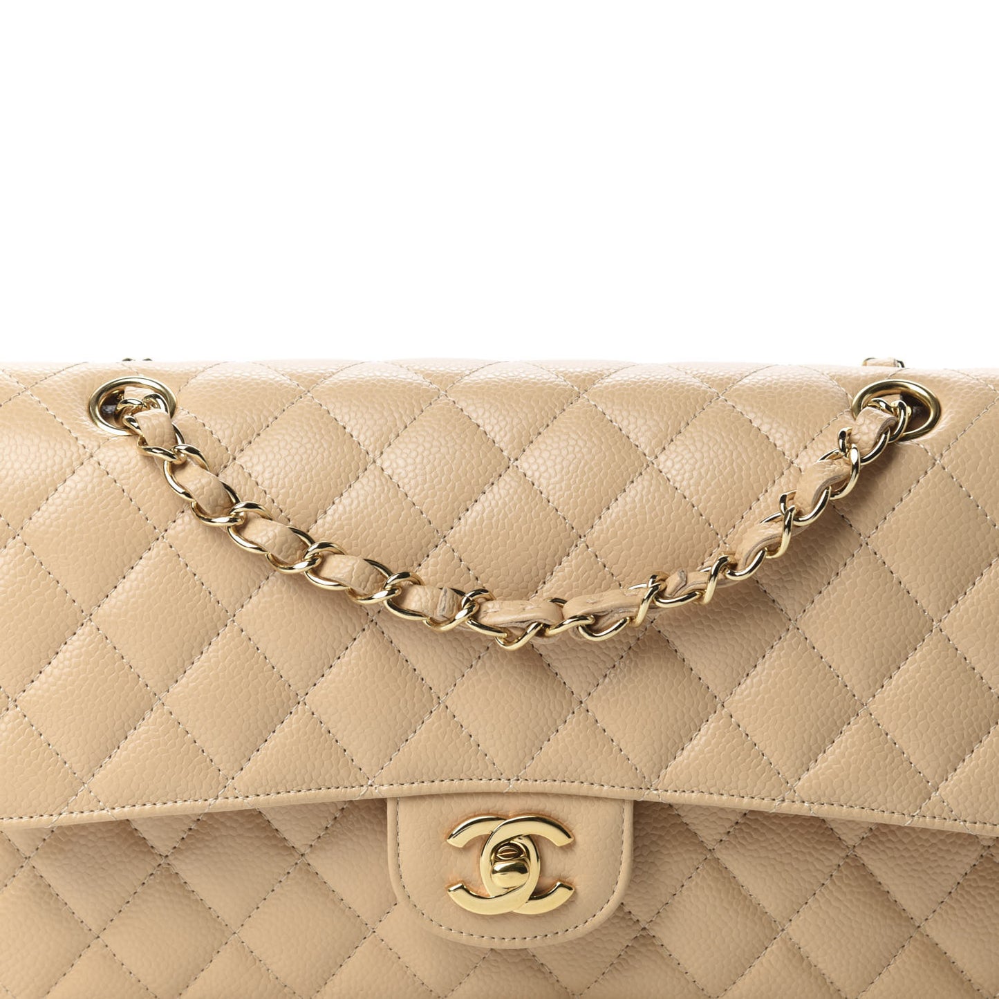 This is an authentic CHANEL Caviar Quilted Medium Double Flap in Beige Clair. This stylish shoulder bag is crafted of luxurious caviar leather in beige. The bag features polished gold chain link leather threaded shoulder straps and Chanel CC interlocking turn lock on the front flap. The flap opens to an inner flap and a matching leather interior with patch pockets.Follow this item for alerts. Chanel is a registered trademark of Chanel. FASHIONPHILE is not affiliated with Chanel.