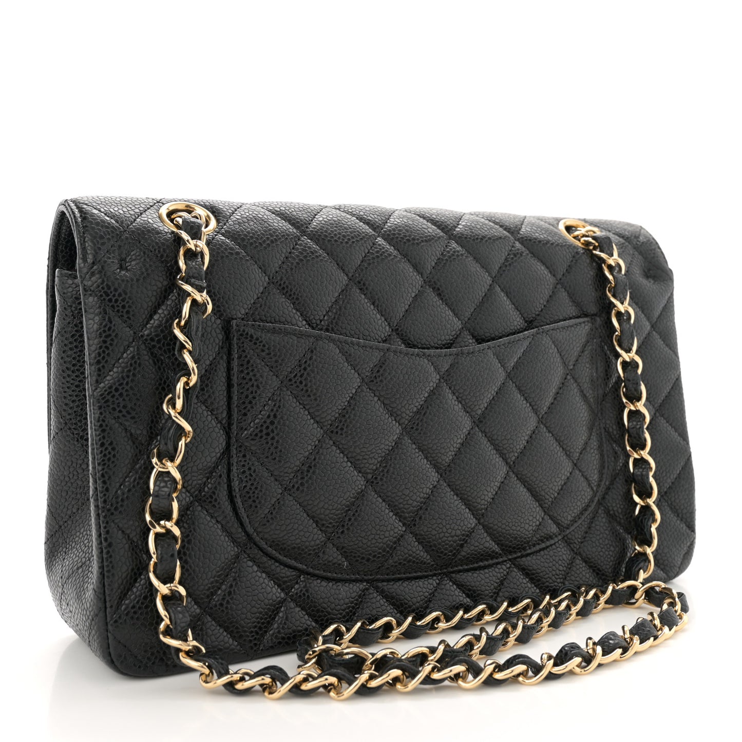 This is an authentic CHANEL Caviar Quilted Medium Double Flap in Black. This elegant shoulder bag is crafted of luxurious caviar textured leather in black. The bag features a leather-threaded gold chain-link shoulder strap, a rear patch pocket, and a crossover flap with a gold classic CC turn lock. The flap opens to reveal an inner flap and a burgundy leather interior with pockets.Follow this item for alerts. Chanel is a registered trademark of Chanel. FASHIONPHILE is not affiliated with Chanel.