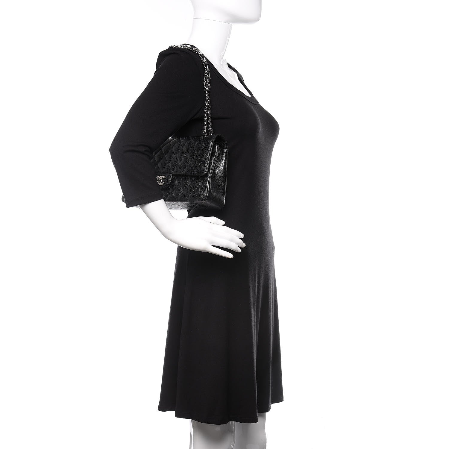 This is an authentic CHANEL Caviar Quilted Medium Double Flap in Black. This shoulder bag is crafted of luxurious diamond-quilted caviar leather in black. The bag features a rear patch pocket, a leather-threaded polished silver chain link shoulder strap, and a matching classic CC turn lock on the crossover flap. This opens the bag to reveal an inner flap, front pocket, and a smooth burgundy leather interior with patch pockets. Satisfy your practical needs as well as your demand for style with this lovely classic, from Chanel!Follow this item for alerts. Chanel is a registered trademark of Chanel. FASHIONPHILE is not affiliated with Chanel.