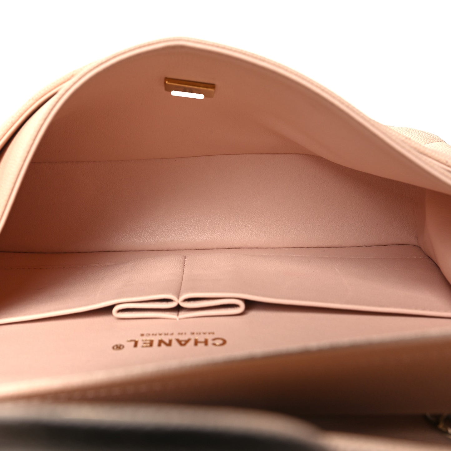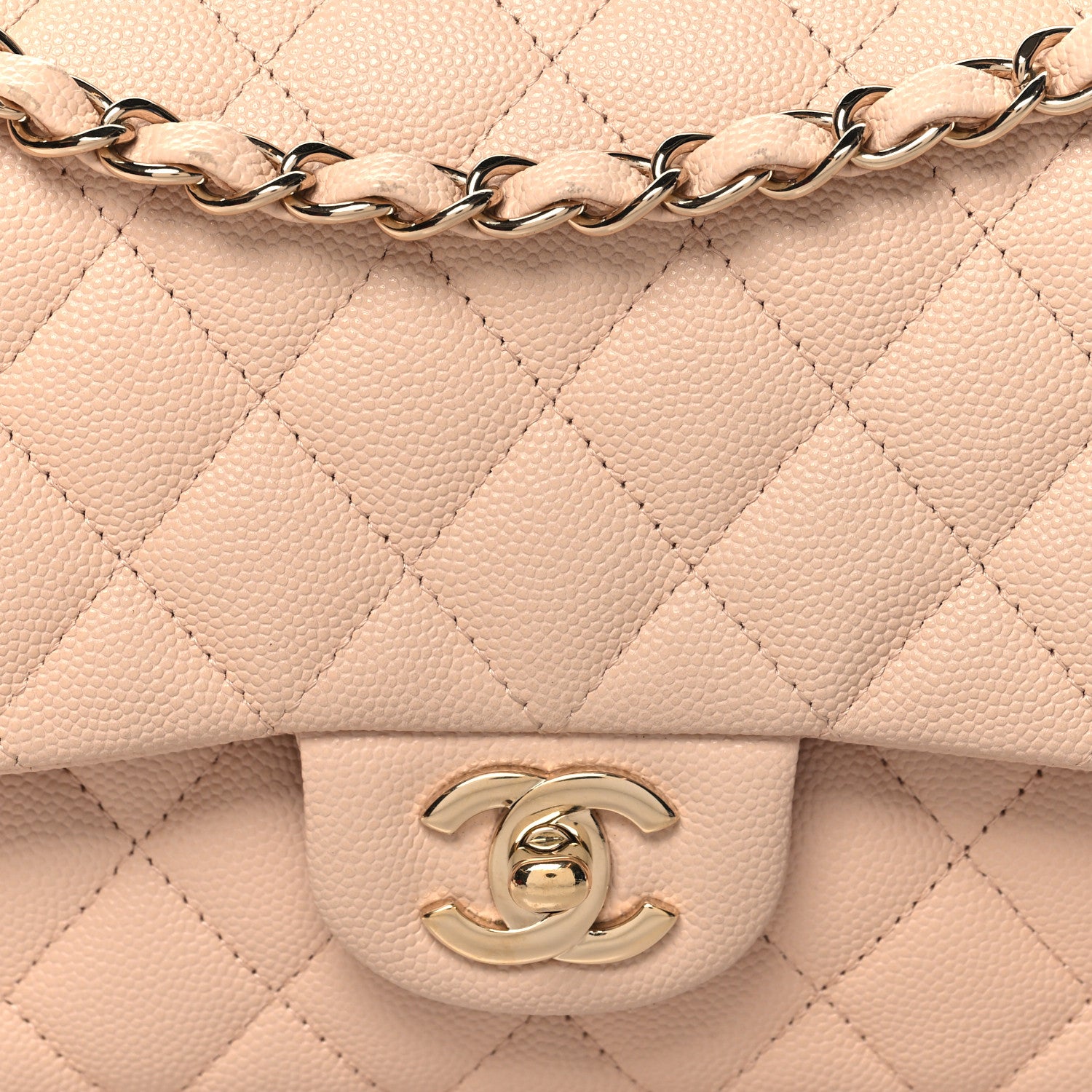 This is an authentic CHANEL Caviar Quilted Medium Double Flap in Light Beige. This shoulder bag is crafted of quilted caviar leather in beige. The bag features leather threaded gold chainlink shoulder straps, a rear slip pocket, and a gold Chanel CC turn lock on the front. This opens the crossover flap to an inner flap and a smooth leather interior with pockets.Follow this item for alerts. Chanel is a registered trademark of Chanel. FASHIONPHILE is not affiliated with Chanel.