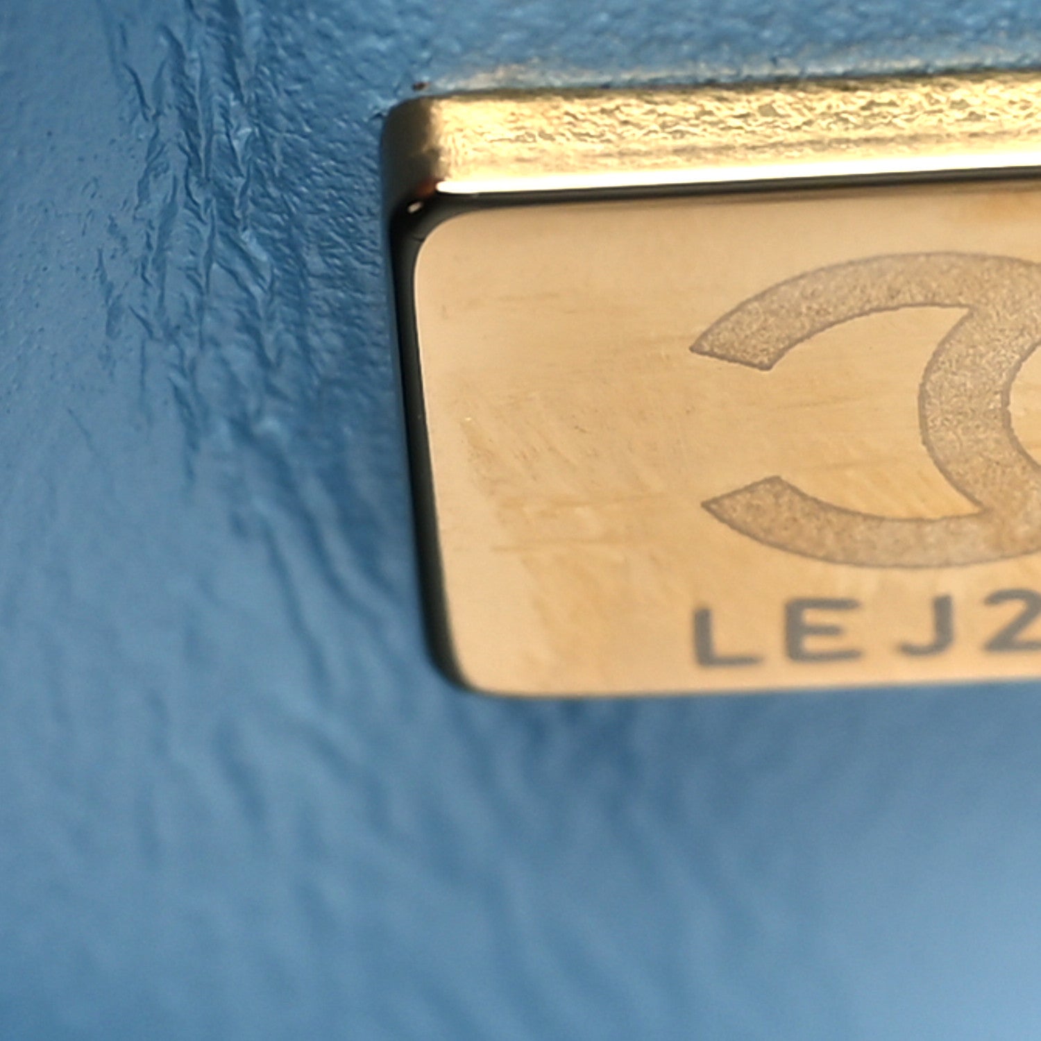 This is an authentic CHANEL Caviar Quilted Medium Double Flap in Light Blue. This medium classic flap bag is crafted of light blue caviar leather. The bag features a light gold chain link shoulder straps threaded with leather and a front flap with a light gold Chanel CC turn lock. The flap opens to a matching leather interior with a zipper compartment and patch pockets.