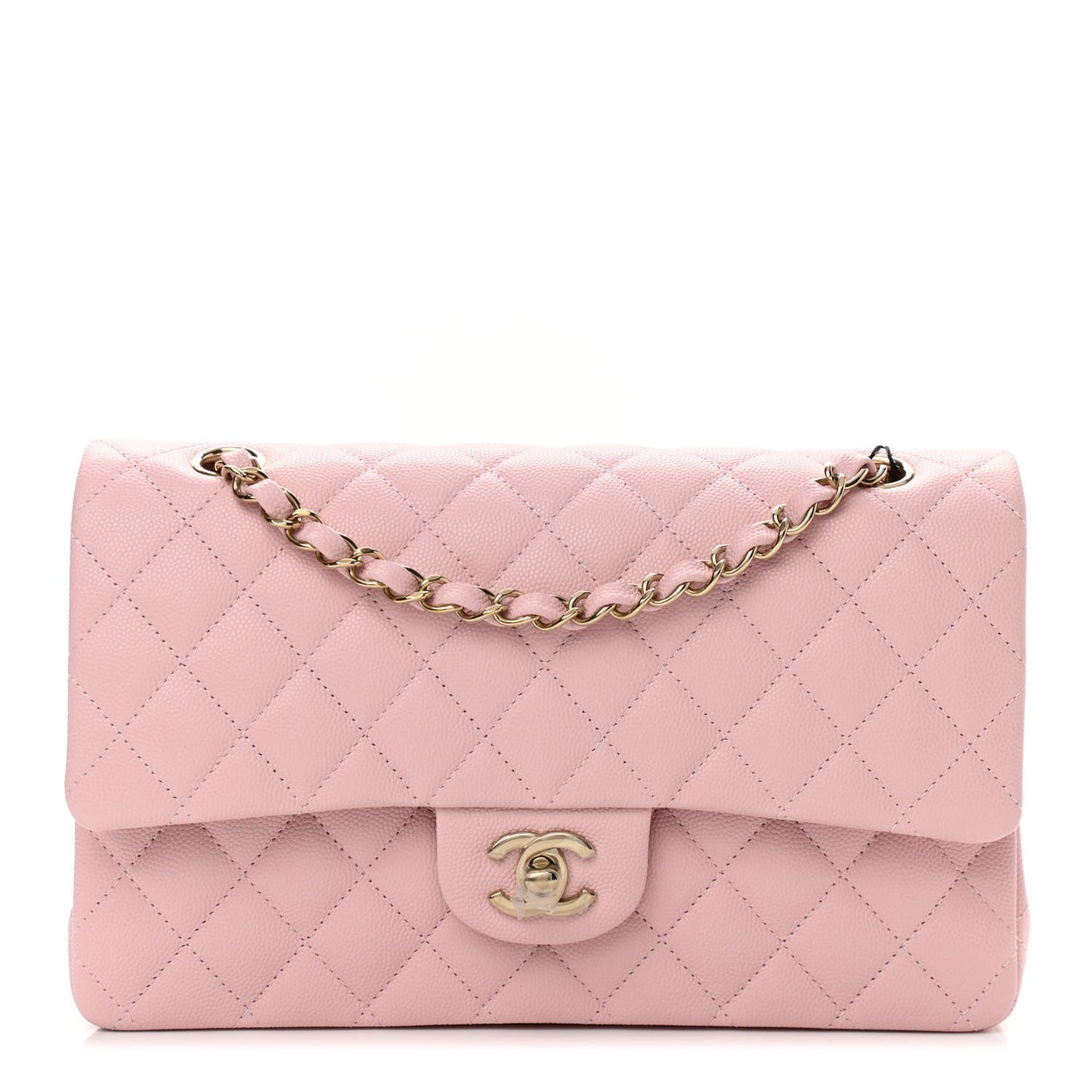 This is an authentic CHANEL Caviar Quilted Medium Double Flap in Light Pink. This medium classic flap bag is beautifully crafted of luxurious light pink caviar leather. The bag features a gold chain-link shoulder strap threaded with pink leather, a crossover flap, and a gold Chanel CC turn-lock on the front. This handbag opens to a second flap and a matching pink matte leather interior with patch pockets.Follow this item for alerts. Chanel is a registered trademark of Chanel. FASHIONPHILE is not affiliated with Chanel.