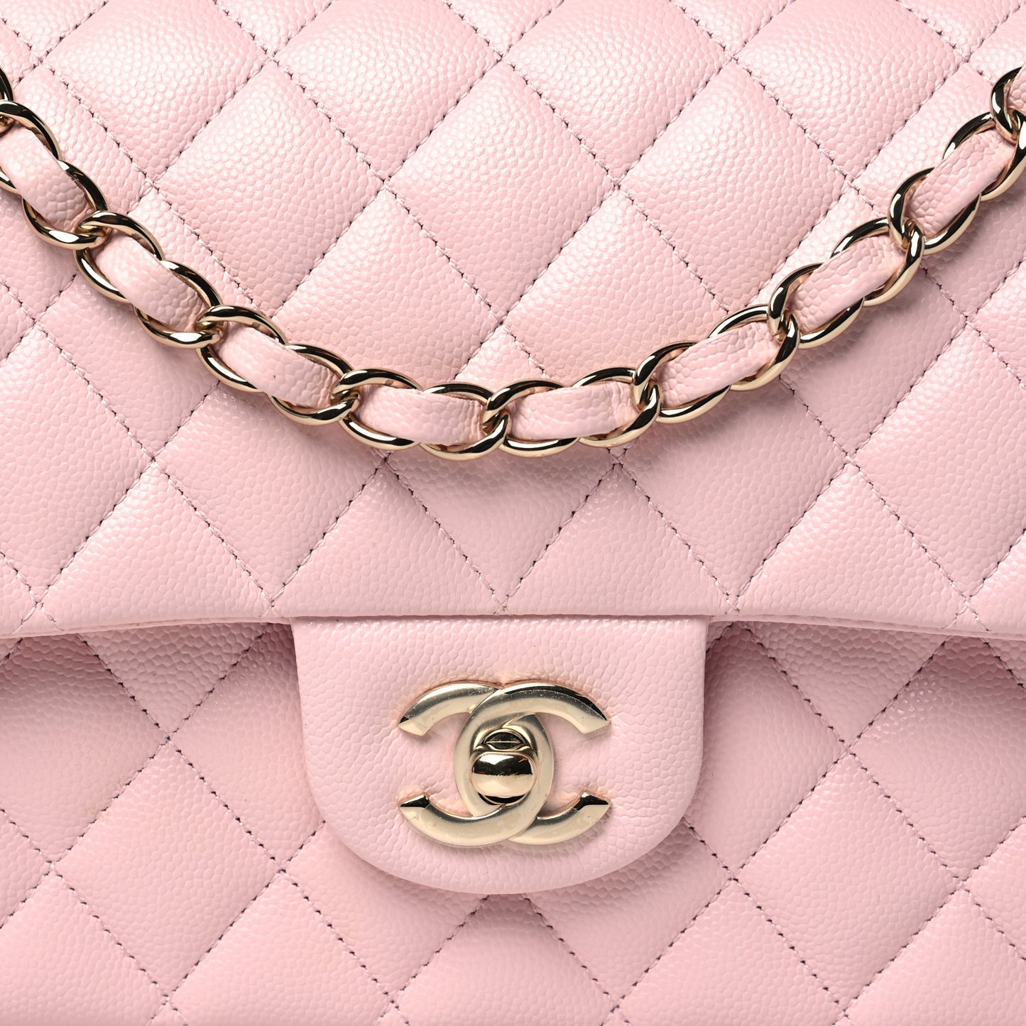 This is an authentic CHANEL Caviar Quilted Medium Double Flap in Light Pink. This medium classic flap bag is beautifully crafted of luxurious pink caviar leather. The bag features a gold chain-link shoulder strap threaded with pink leather, a crossover flap, and a gold Chanel CC turn-lock on the front. This handbag opens to an inner flap and a matching pink matte leather interior with pockets.Follow this item for alerts. Chanel is a registered trademark of Chanel. FASHIONPHILE is not affiliated with Chanel.