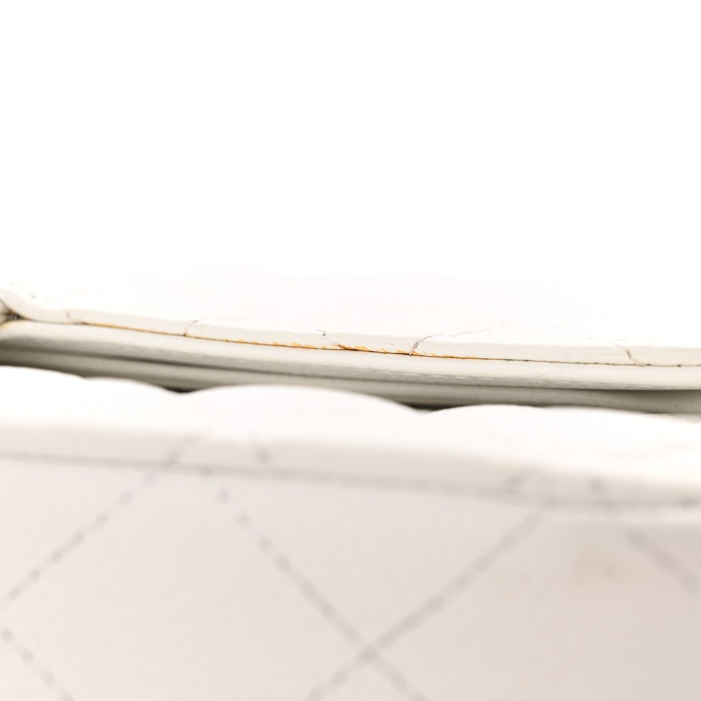 This is an authentic CHANEL Caviar Quilted Medium Double Flap White. This stunning shoulder bag is crafted of diamond quilted luxurious caviar leather in white. The bag features a silver chain-link leather-threaded shoulder strap, a rear patch pocket, and a silver Chanel CC turn lock. This opens to reveal an inner flap and a matte white leather interior with patch pockets.