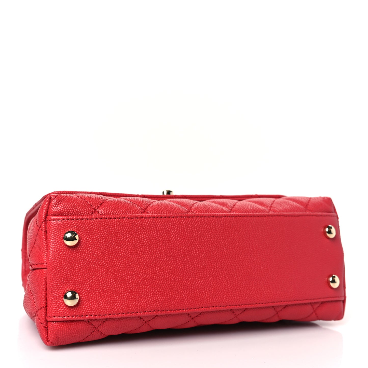 This is an authentic CHANEL Caviar Quilted Mini Coco Handle Flap in Red. This sleek tote is crafted of diamond-quilted caviar leather in red. The bag features a rolled leather top handle, an optional leather-threaded polished gold chain link shoulder strap with a shoulder pad, and a matching gold classic CC turn lock on the crossover flap. This opens the bag to a partitioned matching leather interior with a zipper pocket.Follow this item for alerts. Chanel is a registered trademark of Chanel. FASHIONPHILE is not affiliated with Chanel.