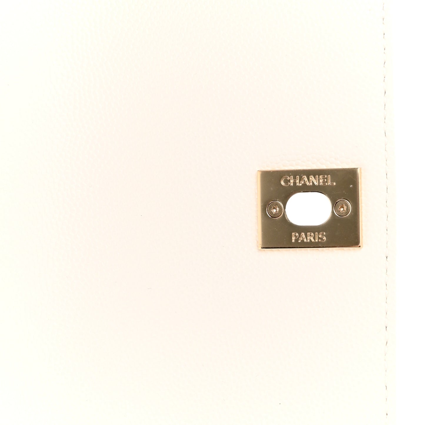 This is an authentic CHANEL Caviar Quilted Mini Coco Handle Flap in White. This tote is crafted of diamond-stitched grained caviar leather in white. The shoulder bag features a top handle, a leather threaded light gold chain-link shoulder strap and CC turn-lock closure. The flap opens to a partitioned white leather interior with a zipper and patch pocket.